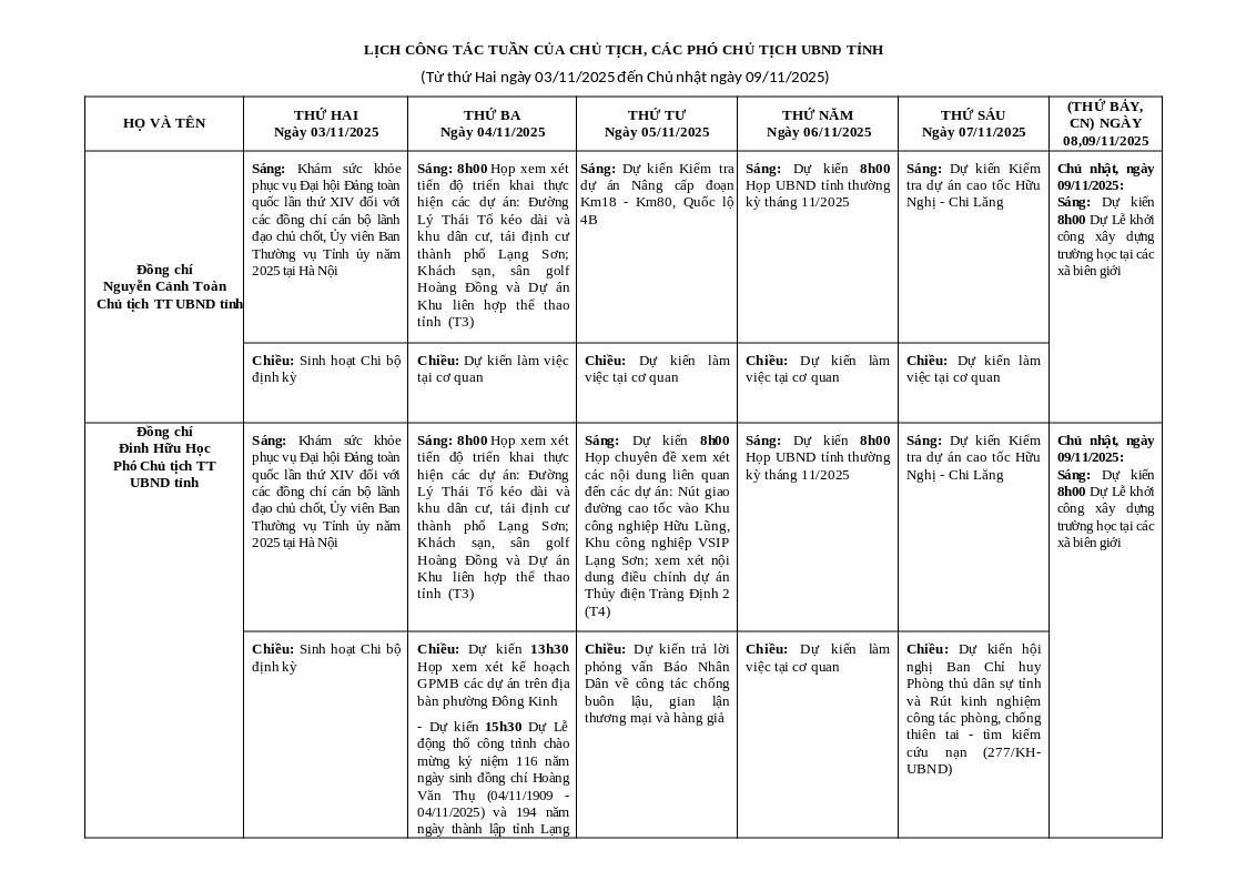 Đồng chí Nguyễn Cảnh Toàn Chủ tịch TT UBND tỉnh | Sáng: Khám sức khỏe phục vụ Đại hội Đảng toàn quốc lần thứ XIV đối với các đồng chí cán bộ lãnh đạo chủ chốt, Ủy viên Ban Thường vụ Tỉnh ủy năm 2025 tại Hà Nội | Sáng: 8h00 Họp xem xét tiến độ triển khai thực hiện các dự án: Đường Lý Thái Tổ kéo dài và khu dân cư, tái định cư thành phố Lạng Sơn; Khách sạn, sân golf Hoàng Đồng và Dự án Khu liên hợp thể thao tỉnh (T3) | Sáng: Dự kiến Kiểm tra dự án Nâng cấp đoạn Km18 - Km80, Quốc lộ 4B | Sáng: Dự kiến 8h00 Họp UBND tỉnh thường kỳ tháng 11/2025 | Sáng: Dự kiến Kiểm tra dự án cao tốc Hữu Nghị - Chi Lăng | Chủ nhật, ngày 09/11/2025: Sáng: Dự kiến 8h00 Dự Lễ khởi công xây dựng trường học tại các xã biên giới |