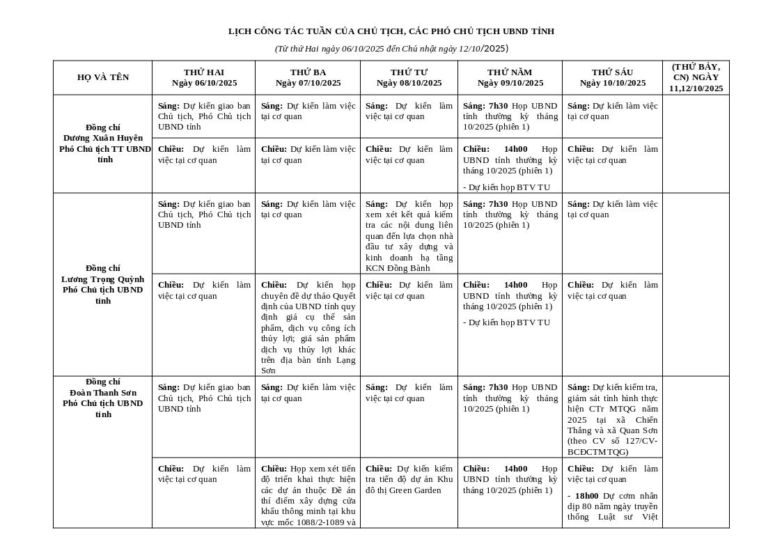 Chiều: Dự kiến làm việc tại cơ quan | Chiều: Dự kiến làm việc tại cơ quan | Chiều: Dự kiến làm việc tại cơ quan | Chiều: 14h00 Họp UBND tỉnh thường kỳ tháng 10/2025 (phiên 1) - Dự kiến họp BTV TU | Chiều: Dự kiến làm việc tại cơ quan | ||