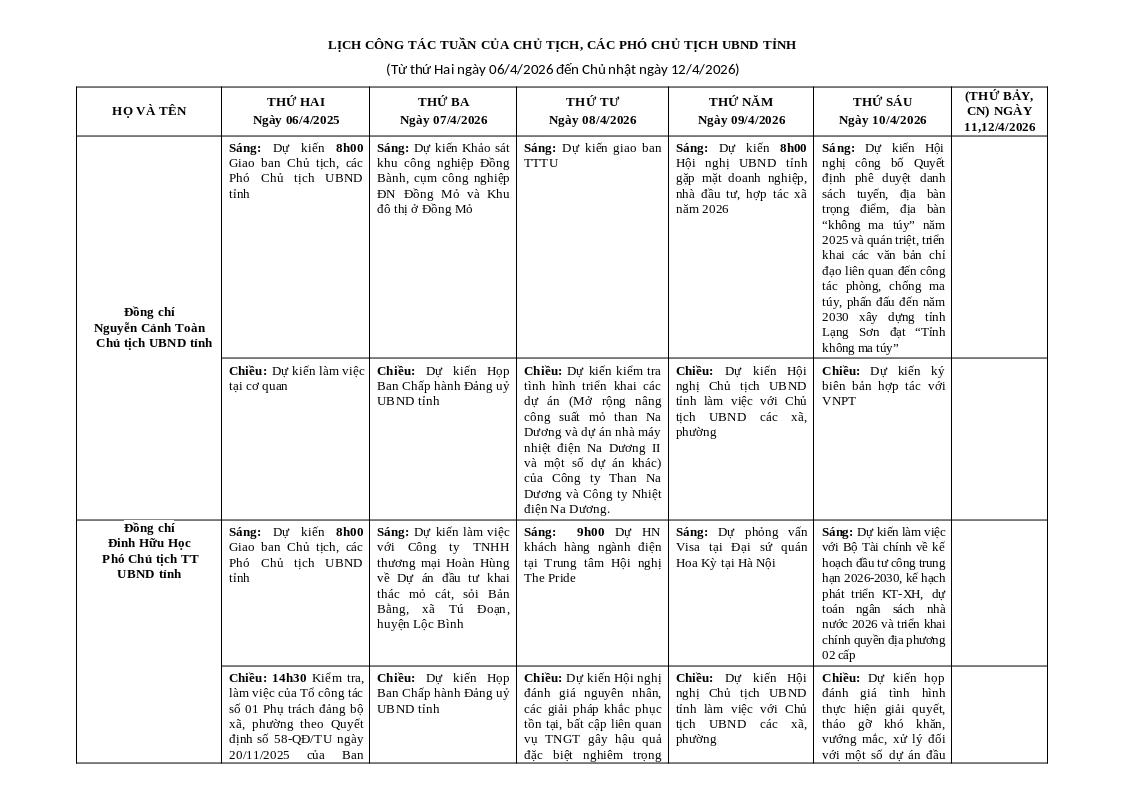 | Chiều: Dự kiến Họp Ban Chấp hành Đảng uỷ UBND tỉnh | Chiều: Dự kiến kiểm tra tình hình triển khai các dự án (Mở rộng nâng công suất mỏ than Na Dương và dự án nhà máy nhiệt điện Na Dương II và một số dự án khác) của Công ty Than Na Dương và Công ty Nhiệt điện Na Dương. | Chiều: Dự kiến Hội nghị Chủ tịch UBND tỉnh làm việc với Chủ tịch UBND các xã, phường | Chiều: Dự kiến ký biên bản hợp tác với VNPT |