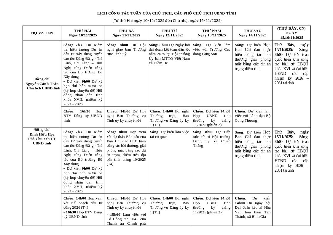 Đồng chí Nguyễn Cảnh Toàn Chủ tịch UBND tỉnh | Sáng: 7h30 Dự Kiểm tra hiện trường Dự án đầu tư xây dựng tuyến cao tốc Đồng Đăng - Trà Lĩnh, Chi Lăng – Hữu Nghị cùng Đoàn công tác của Bộ trưởng Bộ Xây dựng - Dự kiến 9h00 Dự kỳ họp thứ bốn mươi ba (kỳ họp chuyên đề) Hội đồng nhân dân tỉnh khóa XVII, nhiệm kỳ 2021 - 2026 | Sáng: 8h00 Dự Hội nghị giao ban Thường trực Tỉnh uỷ | Sáng: 8h00 Dự Ngày hội đại đoàn kết toàn dân tộc năm 2025 tại Hội trường Ủy ban MTTQ Việt Nam xã Điềm He | Sáng: Dự kiến làm việc với Trường Cao đẳng Lạng Sơn | Sáng: Dự kiến Họp Ban Chỉ đạo thực hiện công tác bồi thường giải phóng mặt bằng các dự án trọng điểm tỉnh | Thứ Bảy, ngày 15/11/2025: Sáng: 8h00 Dự HN toàn quốc triển khai công tác bầu cử ĐBQH khóa XVI và đại biểu HĐND các cấp nhiệm kỳ 2026 – 2031 tại tỉnh |