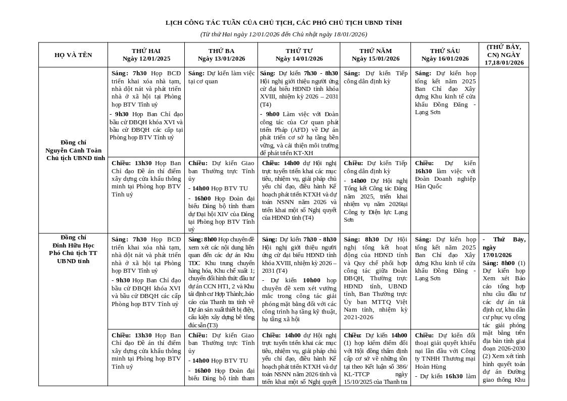 | - Thứ Bảy, ngày 17/01/2026 Sáng: 8h00 (1) Dự kiến họp Xem xét Báo cáo tổng hợp nhu cầu đầu tư các dự án tái định cư, khu dân cư phục vụ công tác giải phóng mặt bằng trên địa bàn tỉnh giai đoạn 2026-2030 (2) Xem xét tình hình quyết toán dự án Đường giao thông Khu công nghiệp Đồng Bành (giai đoạn 1)