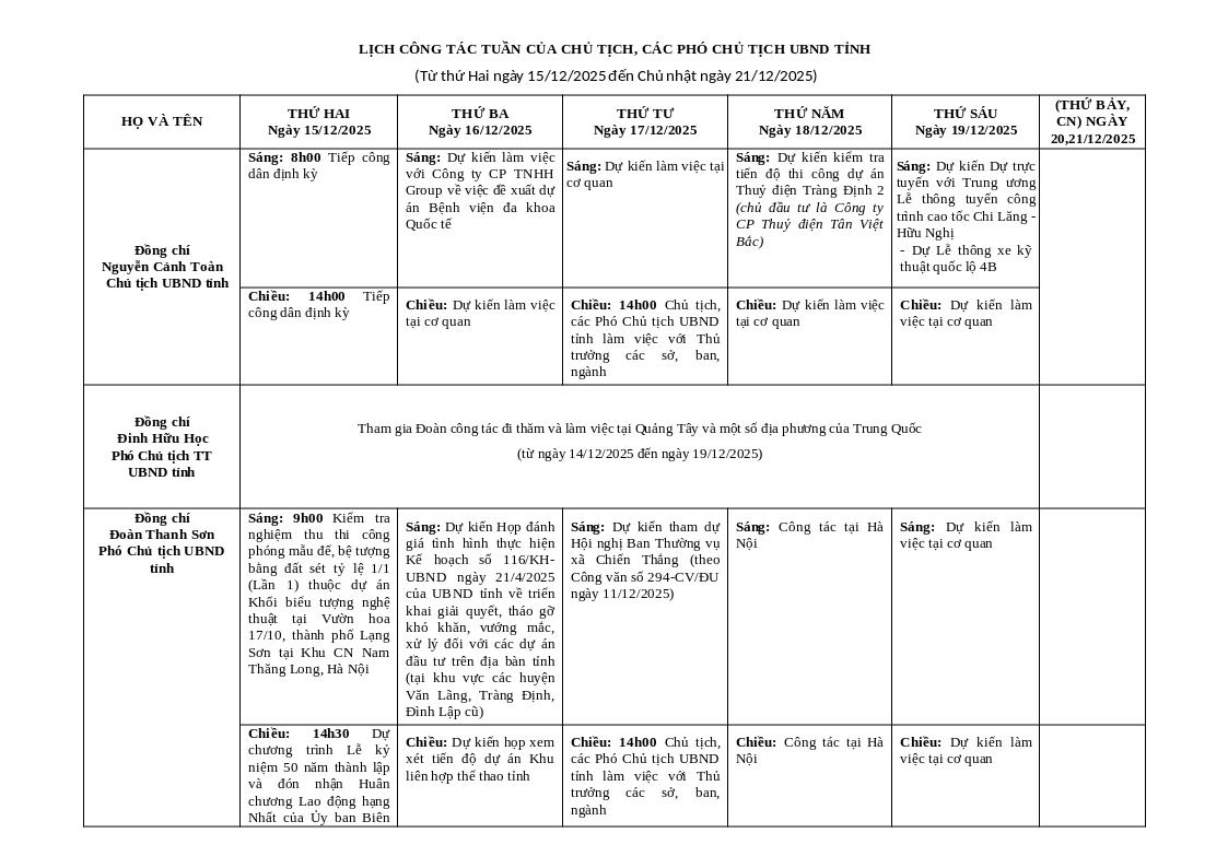 Đồng chí Đoàn Thanh Sơn Phó Chủ tịch UBND tỉnh | Sáng: 9h00 Kiểm tra nghiệm thu thi công phóng mẫu đế, bệ tượng bằng đất sét tỷ lệ 1/1 (Lần 1) thuộc dự án Khối biểu tượng nghệ thuật tại Vườn hoa 17/10, thành phố Lạng Sơn tại Khu CN Nam Thăng Long, Hà Nội | Sáng: Dự kiến Họp đánh giá tình hình thực hiện Kế hoạch số 116/KH-UBND ngày 21/4/2025 của UBND tỉnh về triển khai giải quyết, tháo gỡ khó khăn, vướng mắc, xử lý đối với các dự án đầu tư trên địa bàn tỉnh (tại khu vực các huyện Văn Lãng, Tràng Định, Đình Lập cũ) | Sáng: Dự kiến tham dự Hội nghị Ban Thường vụ xã Chiến Thắng (theo Công văn số 294-CV/ĐU ngày 11/12/2025)