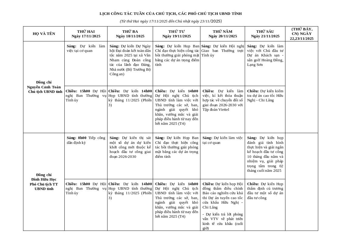 Chiều: 15h00 Dự Hội nghị Ban Thường vụ Tỉnh ủy | Chiều: Dự kiến 14h00 Họp UBND tỉnh thường kỳ tháng 11/2025 (Phiên 3) | Chiều: Dự kiến 14h00 Dự Hội nghị Chủ tịch UBND tỉnh làm việc với Thủ trưởng các sở, ban, ngành giải quyết khó khăn, vướng mắc và giải pháp điều hành từ nay đến hết năm 2025 (T4) | Chiều: Dự kiến làm việc, kí kết thỏa thuận hợp tác về chuyển đổi số giai đoạn 2026-2030 với Tập đoàn Viettel | Chiều: Dự kiến kiểm tra dự án cao tốc Hữu Nghị - Chi Lăng | ||