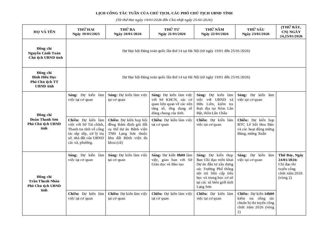 Đồng chí Đoàn Thanh Sơn Phó Chủ tịch UBND tỉnh | Sáng: Dự kiến làm việc tại cơ quan | Sáng: Dự kiến làm việc tại cơ quan | Sáng: Dự kiến làm việc với Sở KHCN, các cơ quan liên quan về các nền tảng số, ứng dụng số dùng chung của tỉnh. | Sáng: Dự kiến làm việc với UBND xã Hữu Liên, kiểm tra thực địa tại Xóm Lân Đặt, thôn Lân Châu | Sáng: Dự kiến làm việc tại cơ quan |