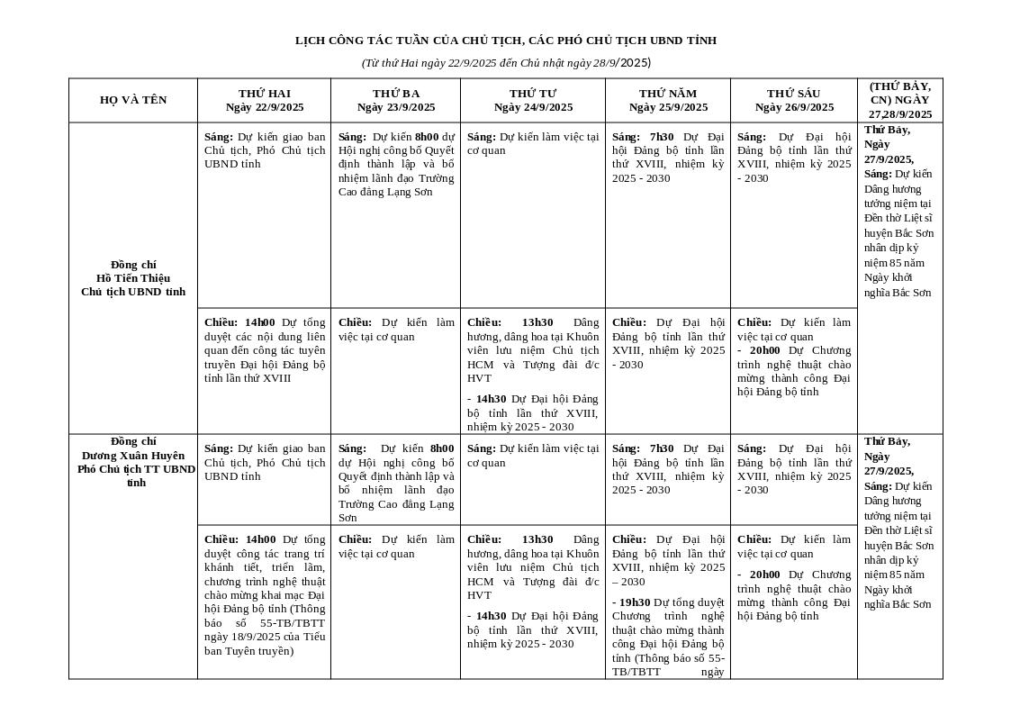 | Sáng: 7h30 Dự Đại hội Đảng bộ tỉnh lần thứ XVIII, nhiệm kỳ 2025 - 2030 | Sáng: Dự Đại hội Đảng bộ tỉnh lần thứ XVIII, nhiệm kỳ 2025 - 2030 | Thứ Bảy, Ngày 27/9/2025, Sáng: Dự kiến Dâng hương tưởng niệm tại Đền thờ Liệt sĩ huyện Bắc Sơn nhân dịp kỷ niệm 85 năm Ngày khởi nghĩa Bắc Sơn |