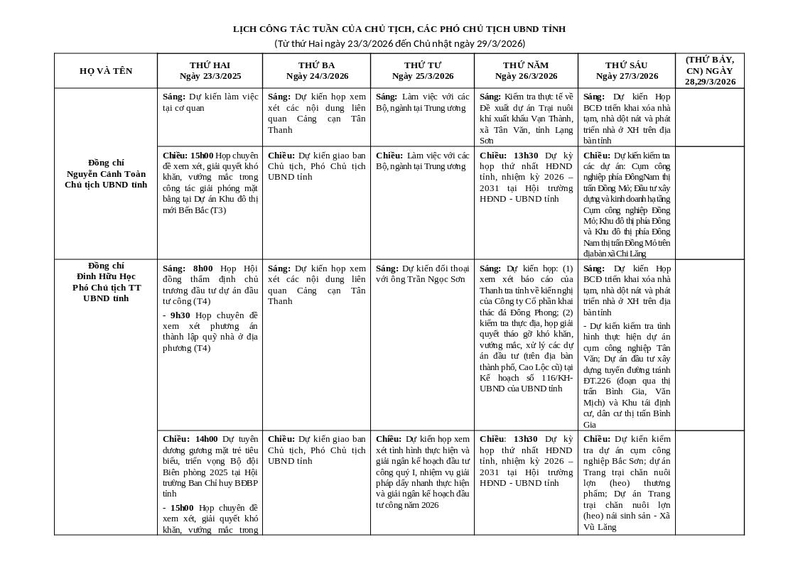 Đồng chí Nguyễn Cảnh Toàn Chủ tịch UBND tỉnh | Sáng: Dự kiến làm việc tại cơ quan | Sáng: Dự kiến họp xem xét các nội dung liên quan Cảng cạn Tân Thanh | Sáng: Làm việc với các Bộ, ngành tại Trung ương | Sáng: Kiểm tra thực tế về Đề xuất dự án Trại nuôi khỉ xuất khẩu Vạn Thành, xã Tân Văn, tỉnh Lạng Sơn | Sáng: Dự kiến Họp BCĐ triển khai xóa nhà tạm, nhà dột nát và phát triển nhà ở XH trên địa bàn tỉnh |
