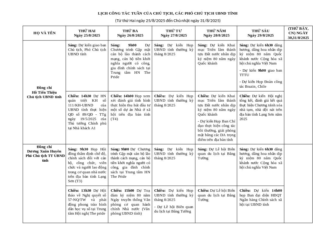 Chiều: Dự kiến làm việc tại cơ quan | Chiều: Dự kiến 15h00 duyệt phóng sự kết quả thực hiện Chương trình xóa nhà tạm, nhà dột nát | Chiều: Dự kiến Họp UBND tỉnh thường kỳ tháng 8/2025 | Chiều: Dự kiến Họp Ban Chỉ đạo thực hiện công tác bồi thường, giải phóng mặt bằng các DA trọng điểm trên địa bàn tỉnh | Chiều: Dự kiến Hội nghị tổng kết, đánh giá kết quả thực hiện Chương trình xóa nhà tạm, nhà dột nát trên địa bàn tỉnh Lạng Sơn năm 2025 |