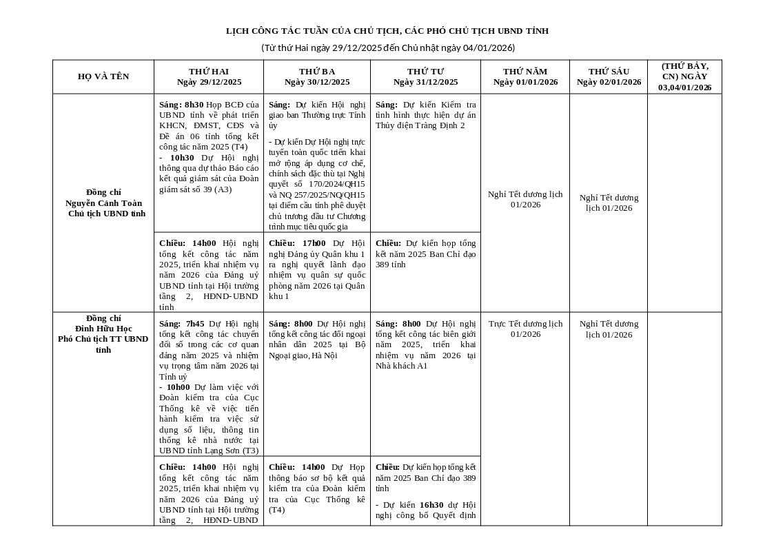 Đồng chí Nguyễn Cảnh Toàn Chủ tịch UBND tỉnh | Sáng: 8h30 Họp BCĐ của UBND tỉnh về phát triển KHCN, ĐMST, CĐS và Đề án 06 tỉnh tổng kết công tác năm 2025 (T4) - 10h30 Dự Hội nghị thông qua dự thảo Báo cáo kết quả giám sát của Đoàn giám sát số 39 (A3) | Sáng: Dự kiến Hội nghị giao ban Thường trực Tỉnh ủy - Dự kiến Dự Hội nghị trực tuyến toàn quốc triển khai mở rộng áp dụng cơ chế, chính sách đặc thù tại Nghị quyết số 170/2024/QH15 và NQ 257/2025/NQ/QH15 tại điểm cầu tỉnh phê duyệt chủ trương đầu tư Chương trình mục tiêu quốc gia | Sáng: Dự kiến Kiểm tra tình hình thực hiện dự án Thủy điện Tràng Định 2 | Nghỉ Tết dương lịch 01/2026 | Nghỉ Tết dương lịch 01/2026 |