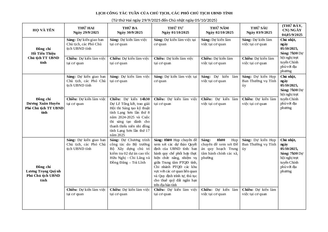Đồng chí Lương Trọng Quỳnh Phó Chủ tịch UBND tỉnh | Sáng: Dự kiến giao ban Chủ tịch, các Phó Chủ tịch UBND tỉnh | Sáng: Dự Chương trình công tác do Bộ trưởng Bộ Xây dựng chủ trì kiểm tra 02 dự án cao tốc Hữu Nghị - Chi Lăng và Đồng Đăng – Trà Lĩnh | Sáng: 8h00 Họp chuyên đề xem xét các dự thảo Quyết định của UBND tỉnh: ban hành quy chế phối hợp thực hiện chức năng, nhiệm vụ giữa Trung tâm PTQĐ tỉnh, Chi nhánh PTQĐ các khu vực với các cơ quan liên quan và Quy định trình tự, thủ tục cho thuê quỹ đất ngắn hạn trên địa bàn tỉnh | Sáng: 8h00 Họp chuyên đề xem xét Đề án quy hoạch Trung tâm hành chính các xã, phường | Sáng: Dự kiến Họp Ban Thường vụ Tỉnh ủy | Chủ nhật, ngày 05/10/2025, Sáng: 7h30 Dự hội nghị trực tuyến Chính phủ với địa phương |