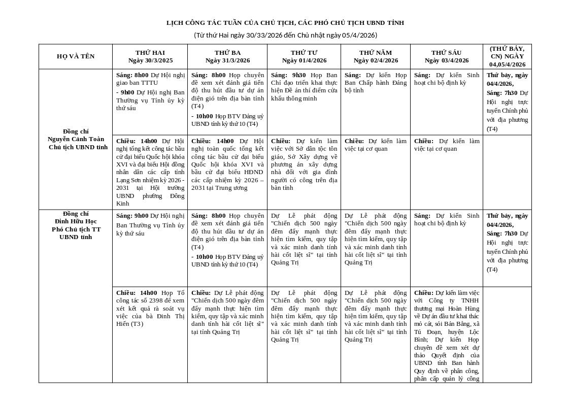 | Sáng: 8h00 Họp chuyên đề xem xét đánh giá tiến độ thu hút đầu tư dự án điện gió trên địa bàn tỉnh (T4) - 10h00 Họp BTV Đảng uỷ UBND tỉnh kỳ thứ 10 (T4) | Sáng: 9h30 Họp Ban Chỉ đạo triển khai thực hiện Đề án thí điểm cửa khẩu thông minh | Sáng: Dự kiến Họp Ban Chấp hành Đảng bộ tỉnh | Sáng: Dự kiến Sinh hoạt chi bộ định kỳ | Thứ bảy, ngày 04/4/2026, Sáng: 7h30 Dự Hội nghị trực tuyến Chính phủ với địa phương (T4) |