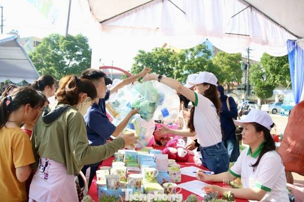 Tại khuôn viên một trường học ở thành phố Lạng Sơn, hàng trăm học sinh và người dân háo hức mang theo vỏ chai nhựa, lon nước, túi nilon... để đổi lấy những món quà nhỏ như cây xanh, sổ tay tái chế, túi vải, bình nước inox. Chỉ trong buổi sáng, hàng chục kg rác thải nhựa đã được thu gom.
