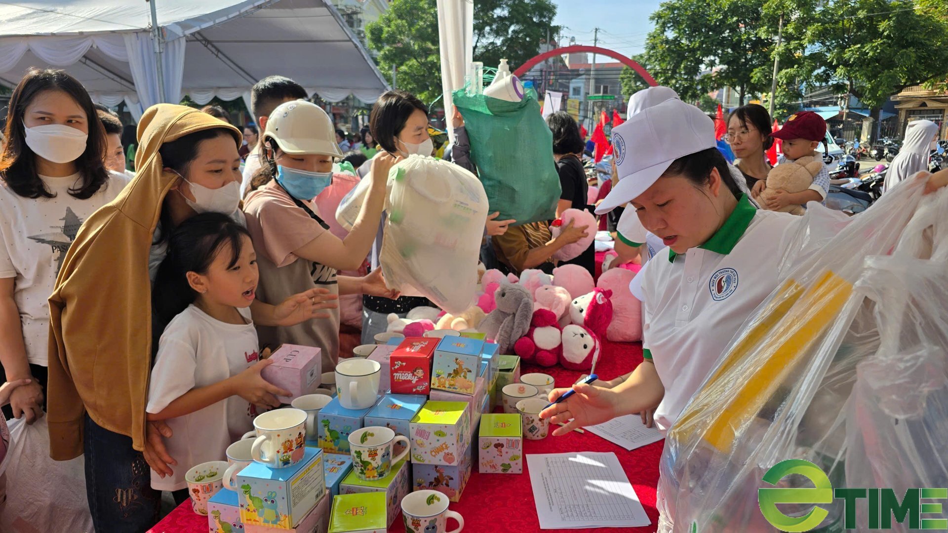 Ngày hội "Đổi rác thải nhựa và phân loại rác lấy quà" thu hút đông đảo học sinh và các tầng lớp nhân dân tham gia hưởng ứng. Ảnh: Hoàng Nghĩa.