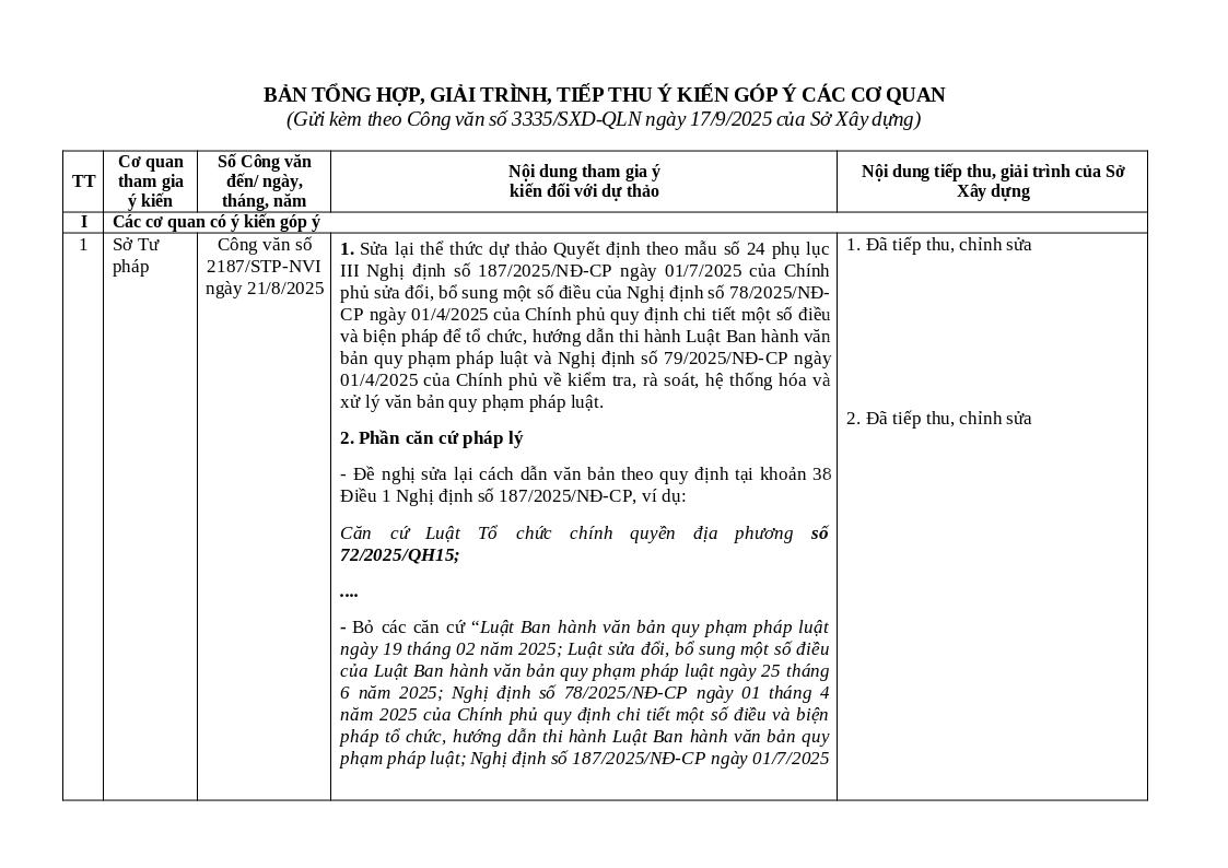 Tiêu đề văn bản | Bản tổng hợp ý kiến, tiếp thu, giải trình ý kiến góp ý trên Cổng thông tin điện tử của tỉnh đối với dự thảo Quyết định Sửa đổi, bổ sung một số điều của các Quyết định của Ủy ban nhân dân tỉnh Lạng Sơn về lĩnh vực Nhà ở, Kinh doanh bất động sản | ||