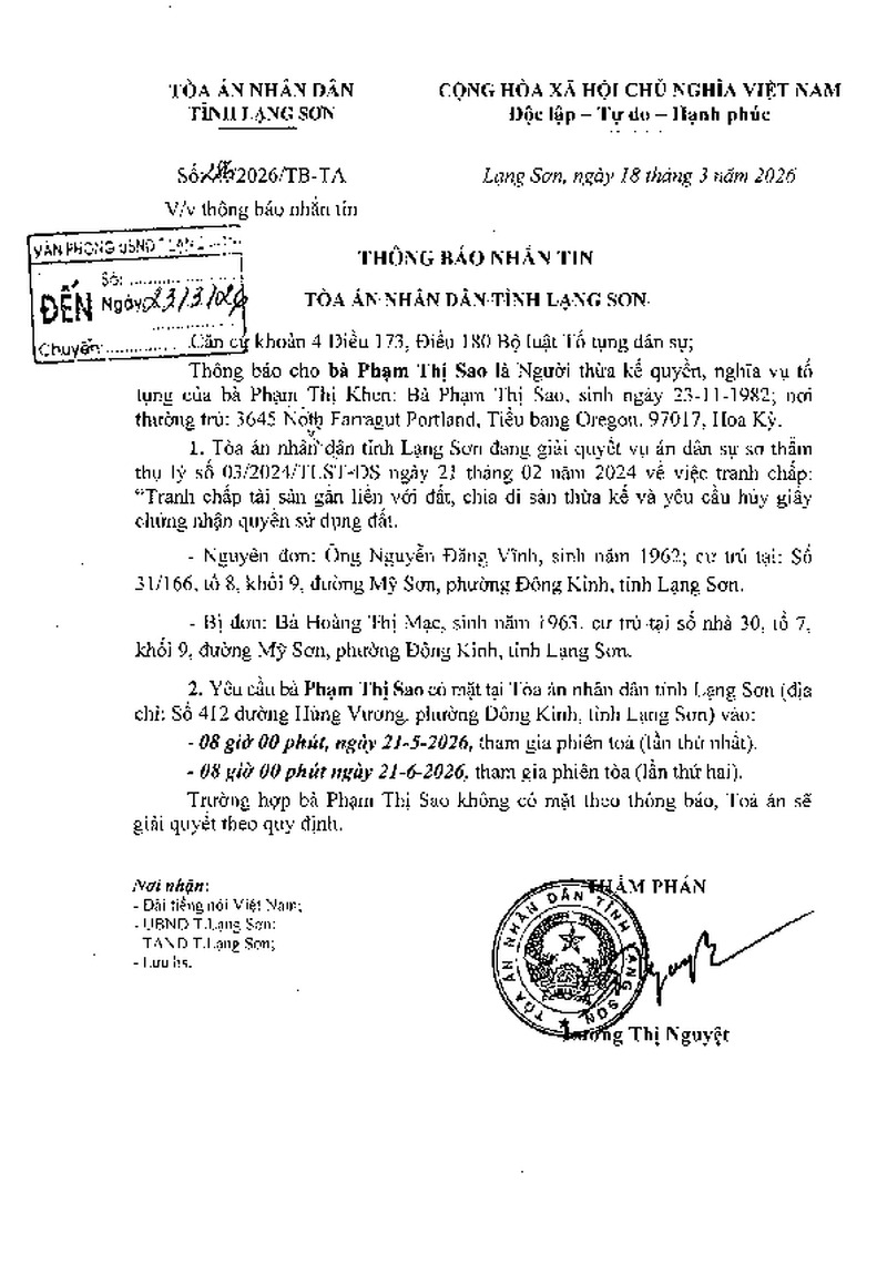 | Tiêu đề văn bản | Thông báo nhắn tin của Tòa án nhân dân tỉnh Lạng Sơn (Bà Phạm Thị Sao, sinh ngày 23/11/1982; nơi thường trú: 3645 North Paragut Portland, Tiểu bang Oregon, 97017, Hoa Kỳ) | ||