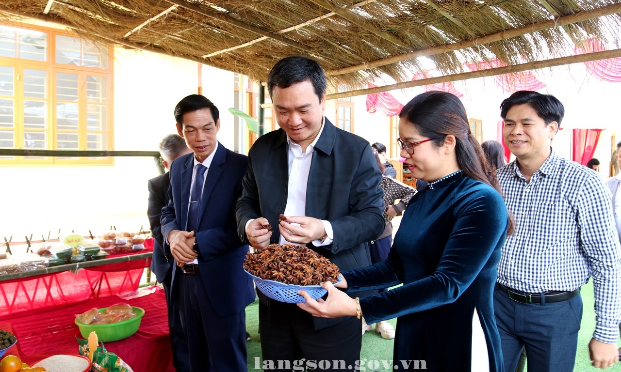 Đồng chí Nguyễn Cảnh Toàn, Phó Bí thư Tỉnh ủy, Chủ tịch UBND tỉnh tham quan gian hàng giới thiệu nông sản xã Điềm He