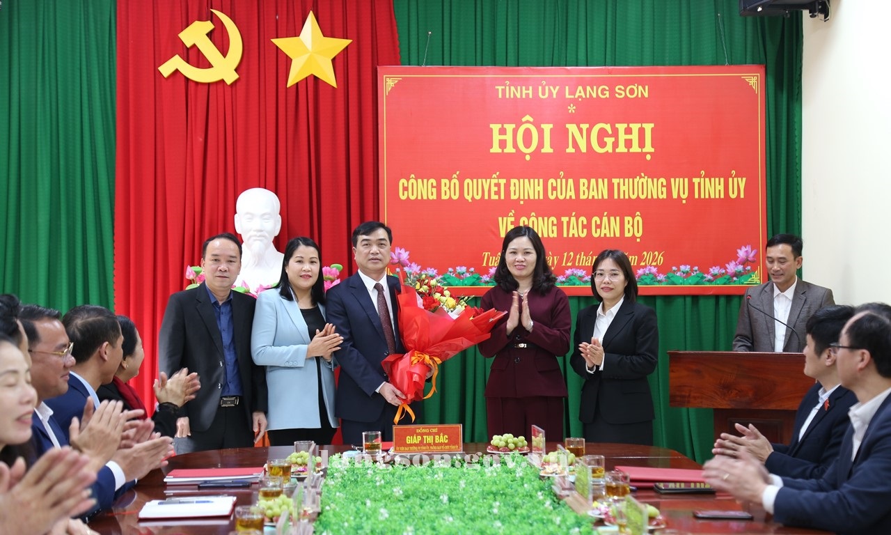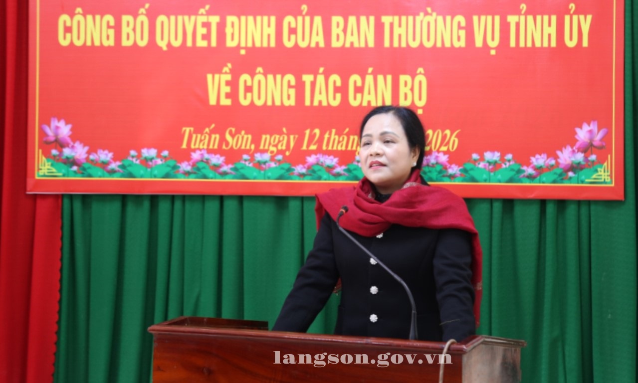 Ngày 12/3/2026, Tỉnh ủy Lạng Sơn tổ chức Hội nghị công bố Quyết định của Ban Thường vụ Tỉnh ủy về công tác cán bộ. Dự hội nghị có đồng chí Giáp Thị Bắc, Ủy viên Ban Thường vụ Tỉnh ủy, Trưởng Ban Tổ chức Tỉnh ủy; lãnh đạo Đảng ủy UBND tỉnh, lãnh đạo Văn phòng UBND tỉnh và các đồng chí Ủy viên Ban Thường vụ Đảng ủy xã Tuấn Sơn.