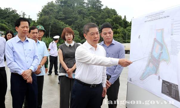 Đồng chí Đoàn Thanh Sơn, Phó Chủ tịch UBND tỉnh Lạng Sơn giới thiệu với đoàn công tác của Ban Thường vụ Tỉnh ủy Sơn La về quy hoạch tổng mặt bằng khu vực bến bãi cửa khẩu thông minh tại cửa khẩu quốc tế Hữu Nghị