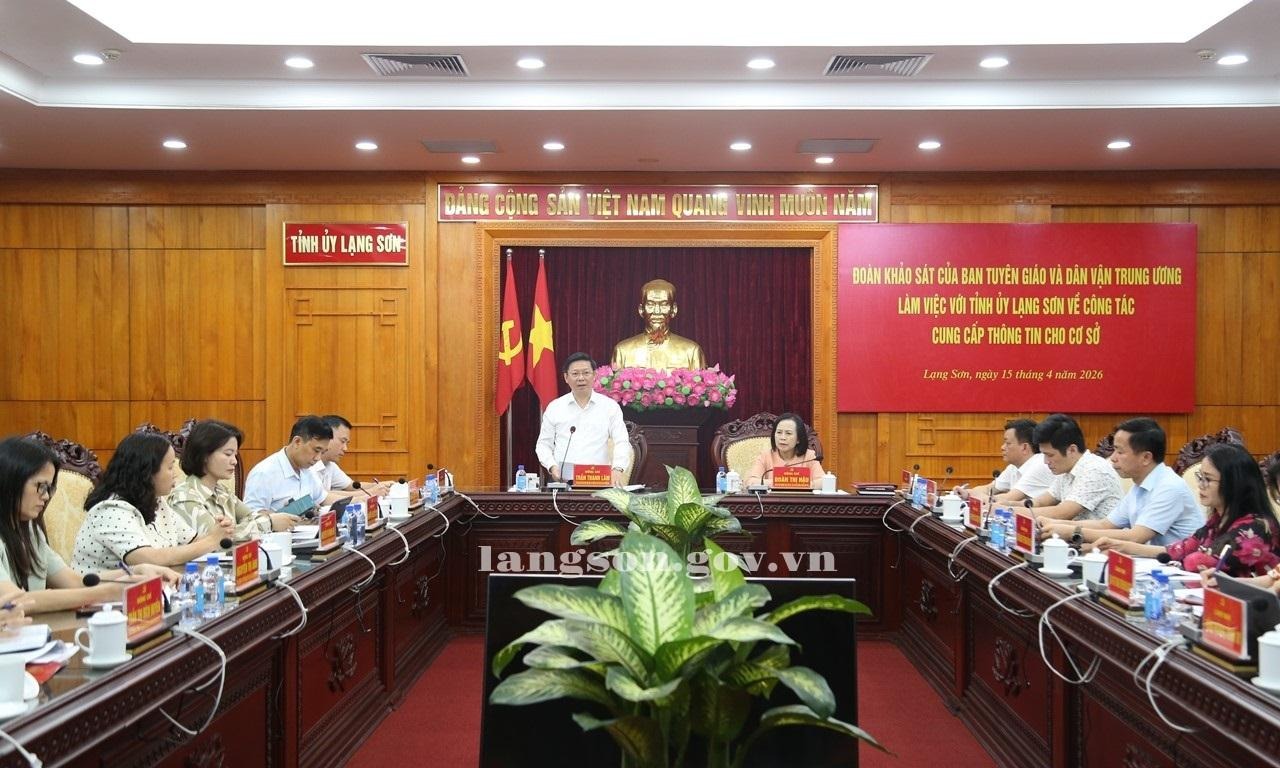 Ngày 15/4/2026, Đoàn công tác của Ban Tuyên giáo và Dân vận Trung ương do đồng chí Trần Thanh Lâm, Uỷ viên Trung ương Đảng, Phó Trưởng Ban Tuyên giáo và Dân vận Trung ương làm trưởng đoàn làm việc với Tỉnh uỷ Lạng Sơn để khảo sát việc thực hiện cung cấp thông tin cho cơ sở. Tiếp và làm việc với đoàn có đồng chí Đoàn Thị Hậu, Phó Bí thư Thường trực Tỉnh uỷ, Chủ tịch HĐND tỉnh; đồng chí Nguyễn Quốc Khánh, Uỷ viên Ban Thường vụ Tỉnh uỷ, Trưởng Ban Tuyên giáo và Dân vận Tỉnh uỷ; lãnh đạo một số sở, ban, ngành của tỉnh.