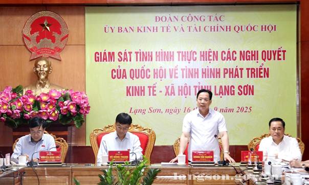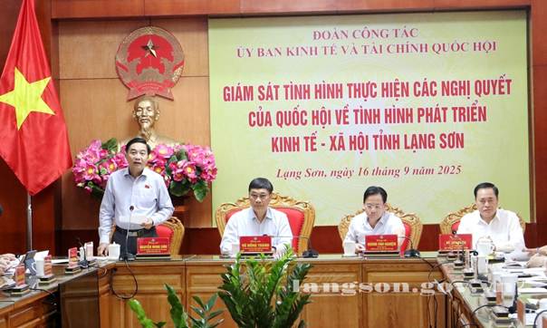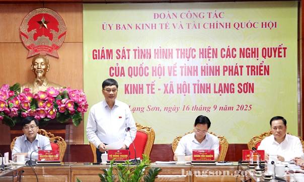 Ngày 16/9/2025, Đoàn công tác Ủy ban Kinh tế và Tài chính Quốc hội do đồng chí Nguyễn Minh Sơn, Phó Chủ nhiệm Ủy ban Kinh tế và Tài chính của Quốc hội làm trưởng đoàn đã giám sát tình hình thực hiện các nghị quyết của Quốc hội về tình hình phát triển kinh tế - xã hội tỉnh Lạng Sơn. Đồng chí Vũ Hồng Thanh, Ủy viên Trung ương Đảng, Phó Chủ tịch Quốc hội dự và chỉ đạo hội nghị.