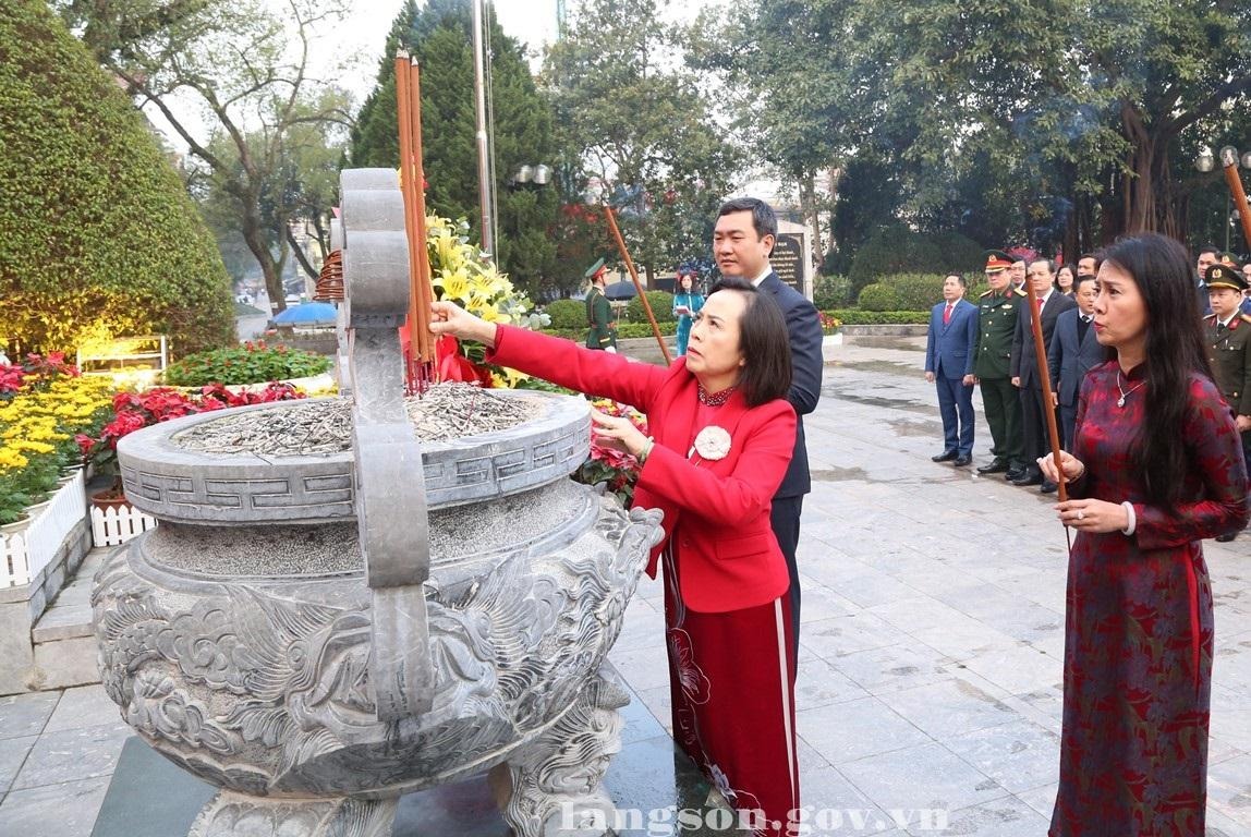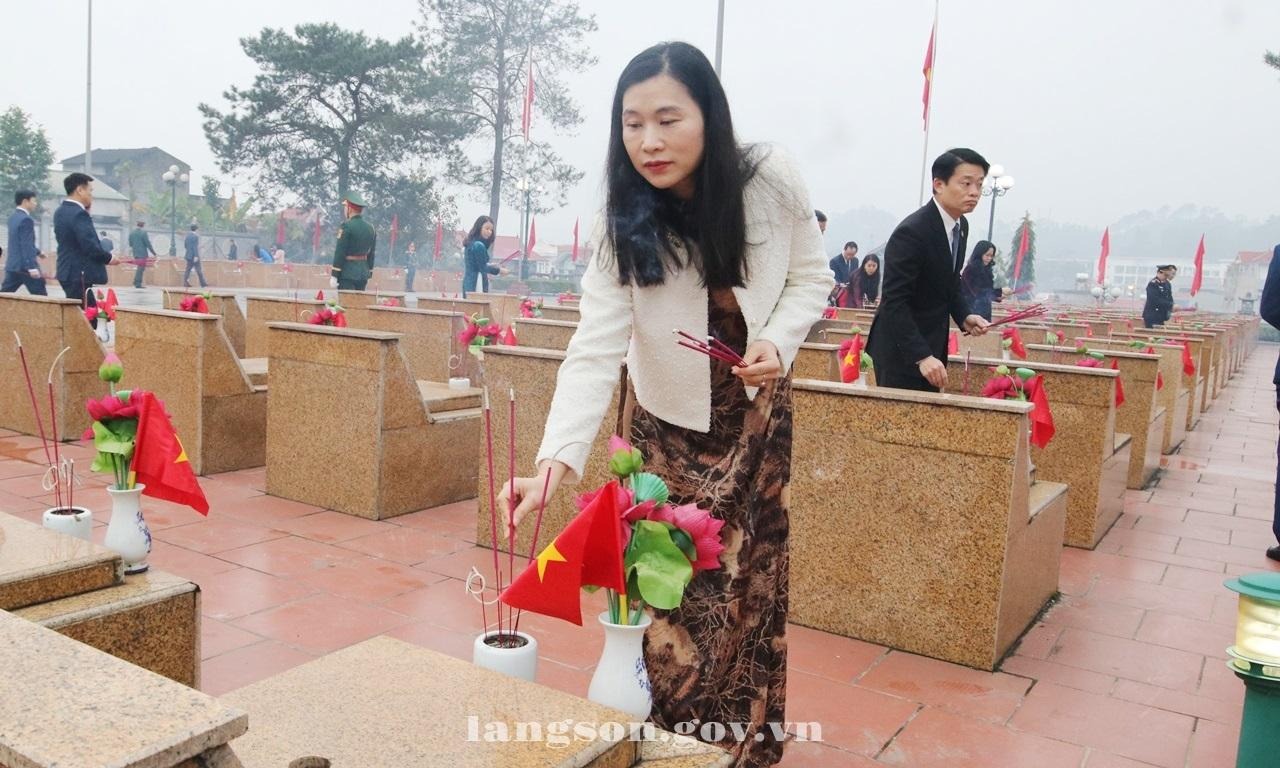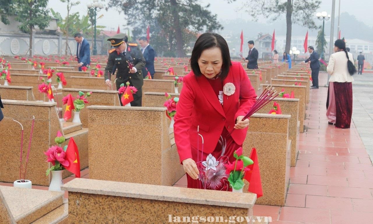 Đồng chí Đoàn Thị Hậu, Phó Bí thư Thường trực Tỉnh ủy, Chủ tịch HĐND tỉnh thắp hương các phần mộ liệt sĩ tại Nghĩa trang liệt sĩ Lạng Sơn