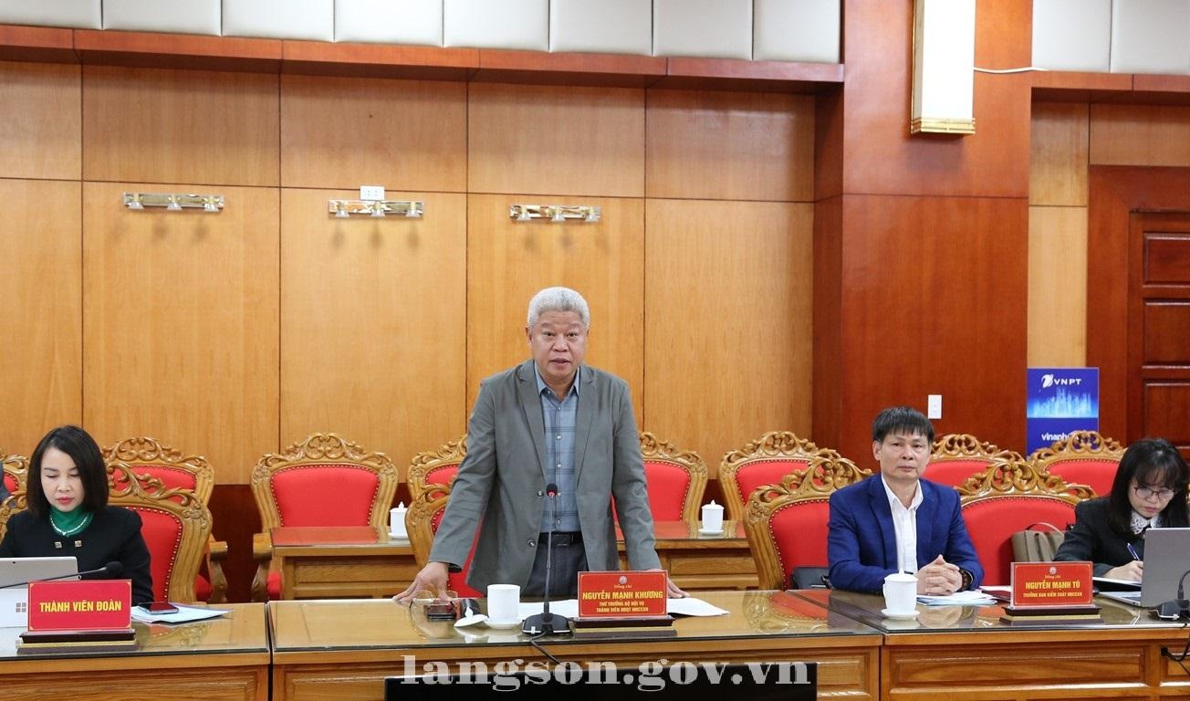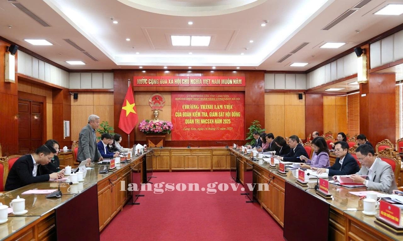 Chiều 16/12/2025, Đoàn kiểm tra, giám sát của thành viên Hội đồng quản trị (HĐQT) Ngân hàng chính sách xã hội (NHCSXH) Trung ương do Thứ trưởng Bộ Nội vụ Nguyễn Mạnh Khương, thành viên HĐQT NHCSXH Trung ương làm trưởng đoàn làm việc với Ban đại diện HĐQT NHCSXH tỉnh về tình hình hoạt động tín dụng chính sách xã hội do NHCSXH thực hiện tại Lạng Sơn. Làm việc với đoàn công tác có đồng chí Đoàn Thanh Sơn, Phó Chủ tịch UBND tỉnh, Trưởng Ban đại diện HĐQT NHCSXH tỉnh, lãnh đạo một số sở, ngành, các tổ chức đoàn thể thành viên Ban đại diện.