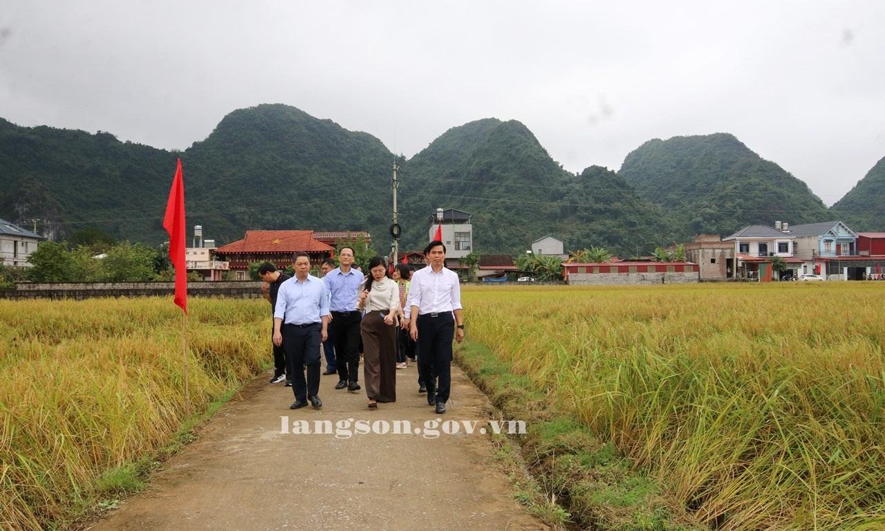 Đồng chí Bí thư Tỉnh uỷ cùng các đồng chí trong đoàn thăm cánh đồng lúa Quỳnh Sơn