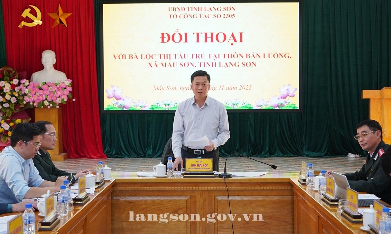 Chiều 24/11/2025, tại Trụ sở UBND xã Mẫu Sơn, đồng chí Đinh Hữu Học, Phó Chủ tịch Thường trực UBND tỉnh, Tổ phó Thường trực Tổ công tác rà soát, xử lý, giải quyết các vụ việc khiếu nại, tố cáo phức tạp về an ninh, trật tự trên địa bàn tỉnh Lạng Sơn (theo Quyết định số 2305/QĐ-UBND) đã chủ trì buổi đối thoại với bà Lộc Thị Tầu để thông tin công khai đến bà về kết quả các nội dung bà yêu cầu giải quyết.