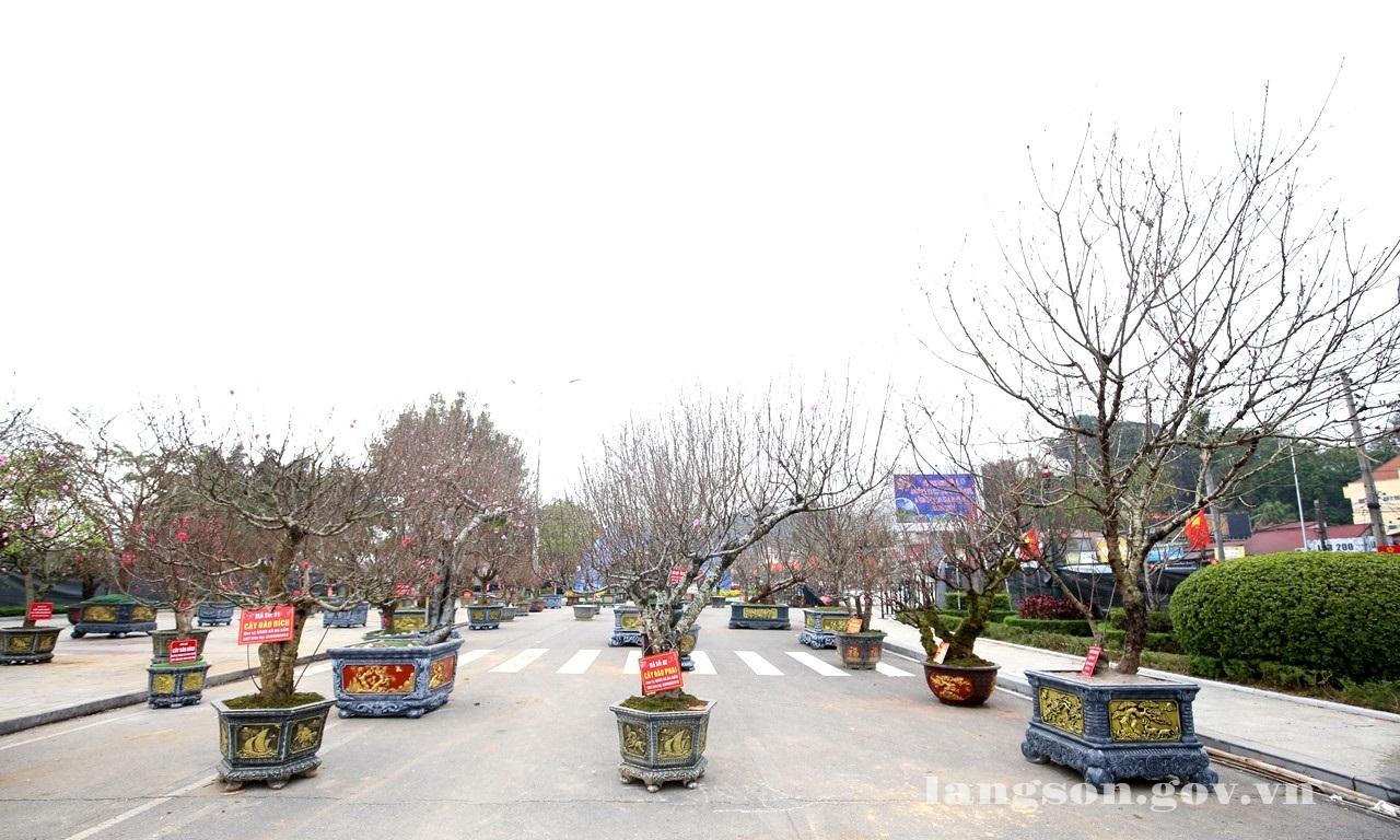 Các chậu hoa đào đẹp được trưng bày tại khu vực đường hoa xuân