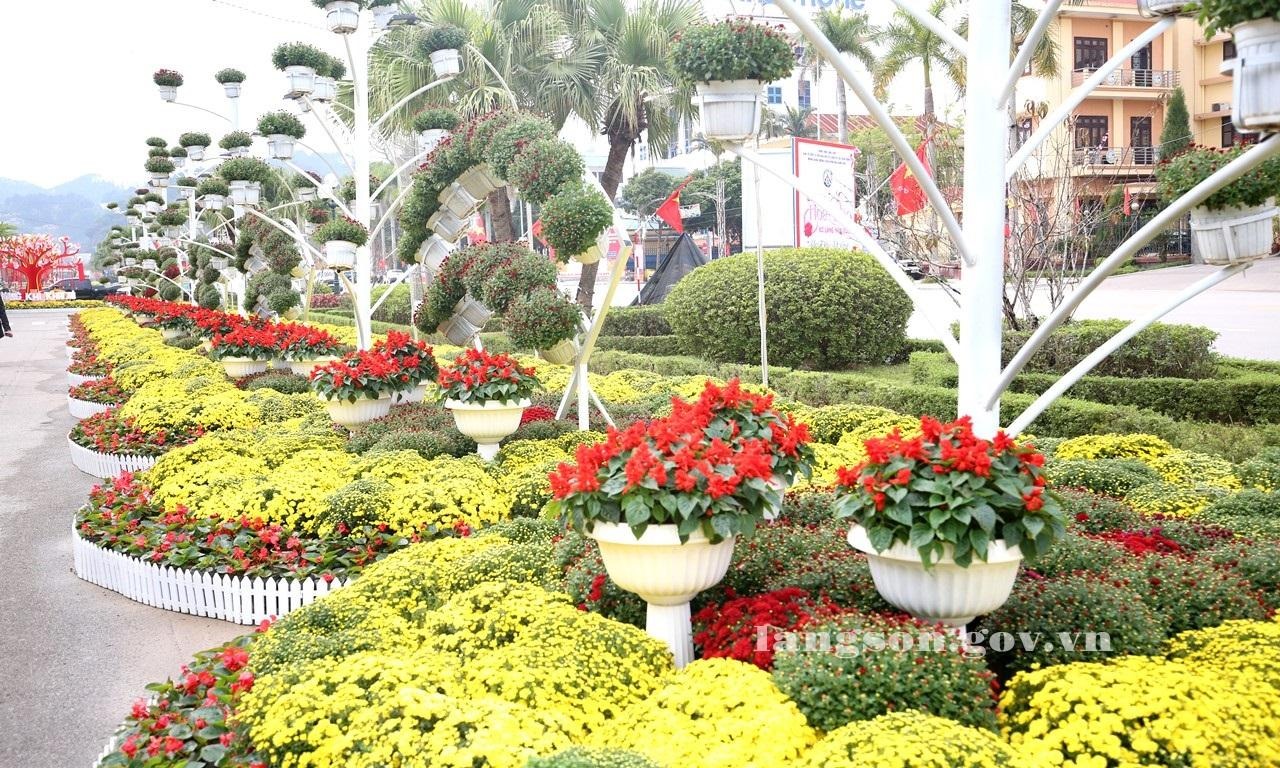Các chậu hoa tươi được trang trí tại khu vực đường hoa xuân