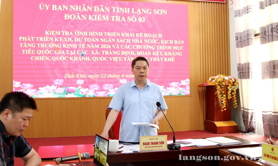 Phát biểu kết luận buổi kiểm tra, đồng chí Đoàn Thanh Sơn, Phó Chủ tịch UBND tỉnh ghi nhận biểu dương cấp ủy, chính quyền các xã đã chủ động ổn định tổ chức bộ máy sau sắp xếp đơn vị hành chính; khẩn trương ban hành nghị quyết, quyết định giao chỉ tiêu phát triển kinh tế - xã hội, dự toán ngân sách nhà nước năm 2026 và triển khai các nhiệm vụ trọng tâm ngay từ đầu năm. Trong đó, xã Thất Khê tiếp tục phát huy vai trò trung tâm khu vực, thu ngân sách đạt 11,159 tỷ đồng, bằng 81% dự toán tỉnh giao; 100% thủ tục hành chính được giải quyết và số hóa. Xã Tràng Định, thu ngân sách đạt 9,6 tỷ đồng, bằng 79,92% kế hoạch phấn đấu; Xã Kháng Chiến duy trì ổn định sản xuất nông nghiệp, tổng đàn bò đạt 195 con, bằng 120,4% kế hoạch, tổng đàn dê đạt 233 con, bằng 122% kế hoạch;….