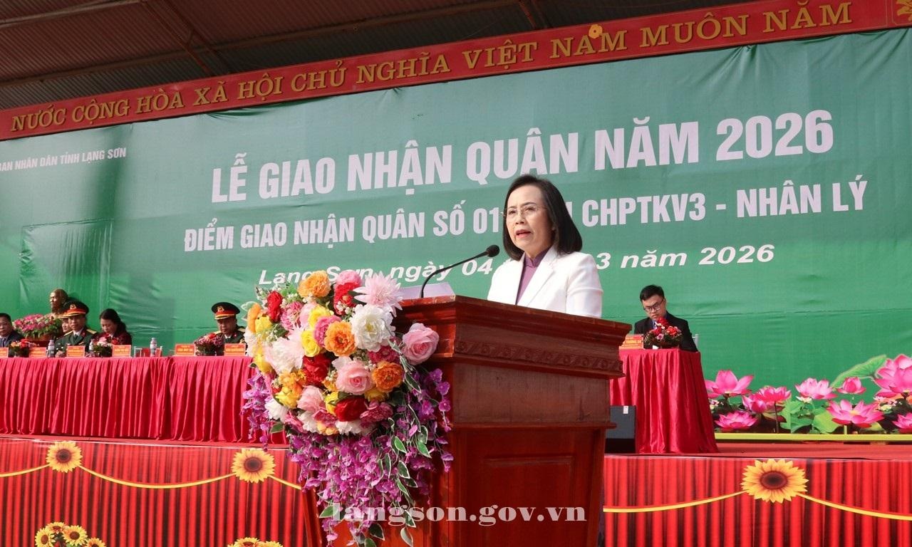Sáng 04/3/2026, đồng chí Đoàn Thị Hậu, Phó Bí thư Thường trực Tỉnh ủy, Chủ tịch HĐND tỉnh dự Lễ giao nhận quân năm 2026 tại điểm giao nhận quân số 1 thuộc Ban Chỉ huy phòng thủ khu vực 3 - Nhân Lý gồm các xã: Chi Lăng, Quan Sơn, Chiến Thắng, Vạn Linh, Bằng Mạc, Nhân Lý. Cùng dự buổi lễ có lãnh đạo Bộ Chỉ huy Quân sự tỉnh, Ủy ban MTTQ Việt Nam tỉnh, đại diện các đơn vị nhận quân và đông đảo cán bộ, Nhân dân trên địa bàn các xã.