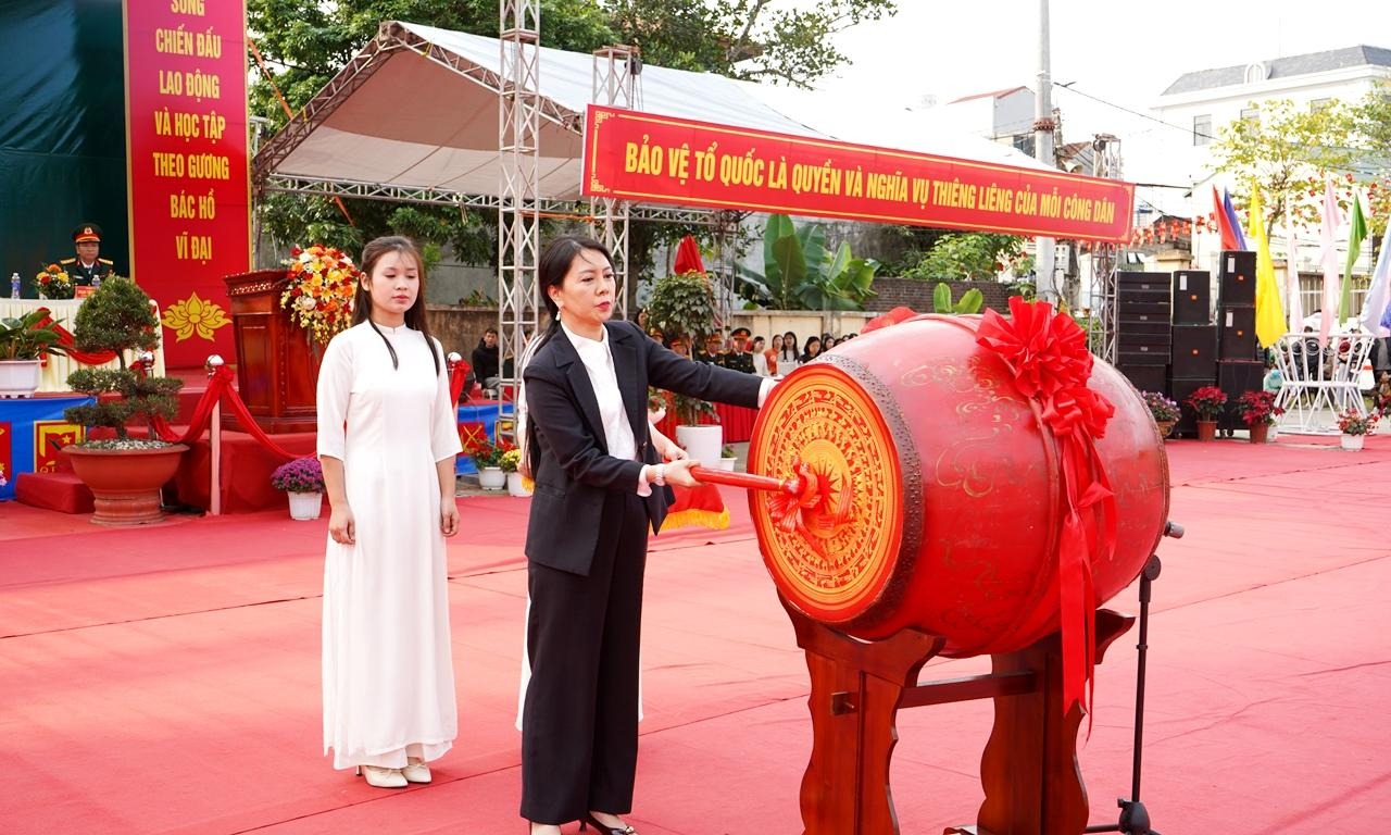 Đồng chí Đoàn Thu Hà, Phó Bí thư Tỉnh uỷ, Chủ tịch Uỷ ban MTTQ Việt Nam tỉnh đánh trống mở hội khai quân