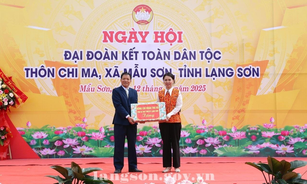 Ngày 12/11/2025, đồng chí Đoàn Thu Hà, Phó Bí thư Tỉnh ủy dự ngày hội đại đoàn kết toàn dân tộc tại thôn Chi Ma, xã Mẫu Sơn. Tham dự có lãnh đạo một số sở, ngành, Uỷ ban MTTQ Việt Nam tỉnh, xã Mẫu Sơn; lãnh đạo khu xã Ái Điểm, trấn Ái Điểm, huyện Ninh Minh (Quảng Tây, Trung Quốc), cùng đông đảo bà con Nhân dân thôn Chi Ma.