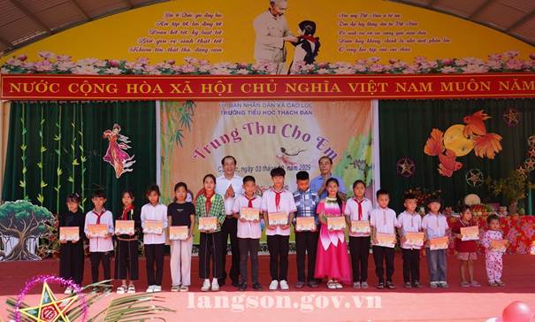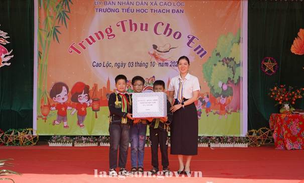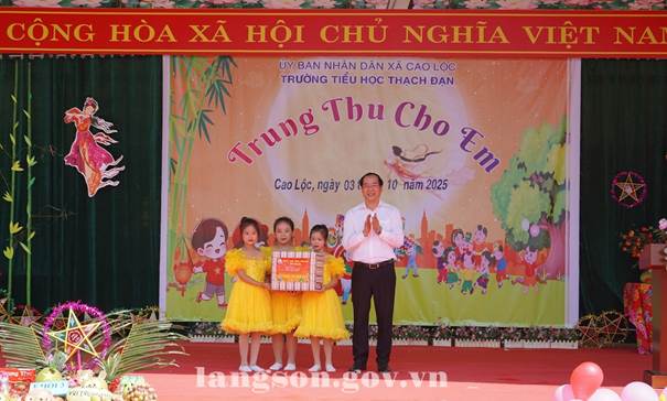 Nhân dịp này, đồng chí Phó Chủ tịch Thường trực UBND tỉnh và các thành viên trong đoàn đã tặng quà trung thu cho các em học sinh trường Tiểu học Thạch Đạn và các em học sinh trên địa bàn xã Cao Lộc.