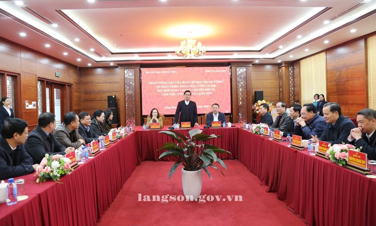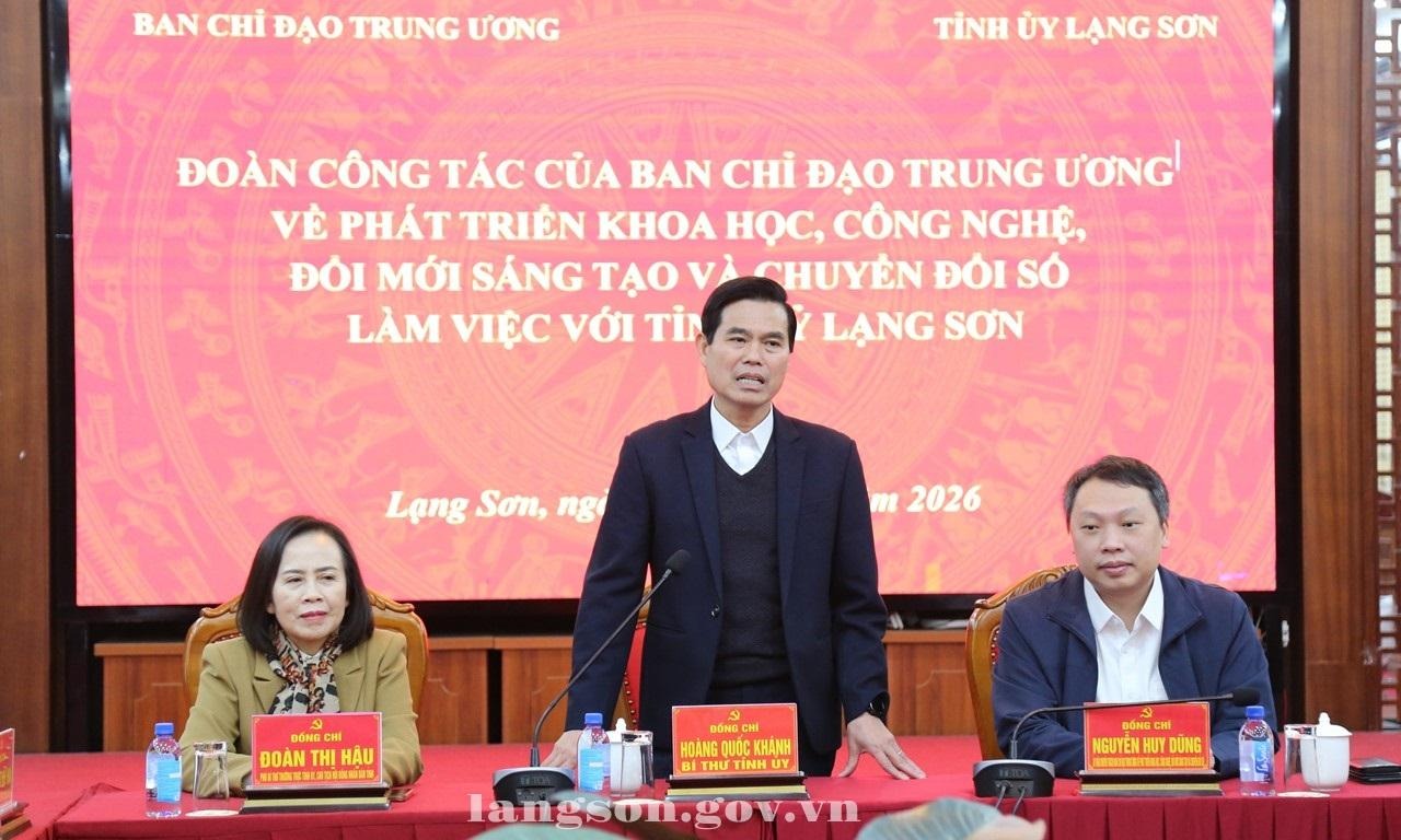 Phát biểu tại buổi làm việc, đồng chí Hoàng Quốc Khánh, Bí thư Tỉnh uỷ trân trọng cảm ơn sự hỗ trợ kịp thời và đầy ý nghĩa của Ban Chỉ đạo Trung ương về phát triển khoa học, công nghệ, đổi mới sáng tạo và chuyển đổi số dành cho tỉnh Lạng Sơn. Đồng chí khẳng định, đây là hoạt động thiết thực, ý nghĩa nhằm hỗ trợ, phát triển hạ tầng số của tỉnh trong bối cảnh Lạng Sơn đang thiếu, hạn chế về thiết bị tin học để đáp ứng nhu cầu của đội ngũ cán bộ, công chức trong xử lý công việc khi tổ chức mô hình chính quyền địa phương 2 cấp. Đồng chí Bí thư Tỉnh ủy cam kết sẽ chỉ đạo phân bổ kịp thời 180 bộ máy tính này về 65 xã, phường và các đơn vị trọng điểm của tỉnh. Đồng thời, sử dụng nguồn hỗ trợ này một cách minh bạch, hiệu quả, góp phần đẩy mạnh phát triển khoa học, công nghệ, đổi mới sáng tạo và chuyển đổi số trên địa bàn tỉnh Lạng Sơn./.