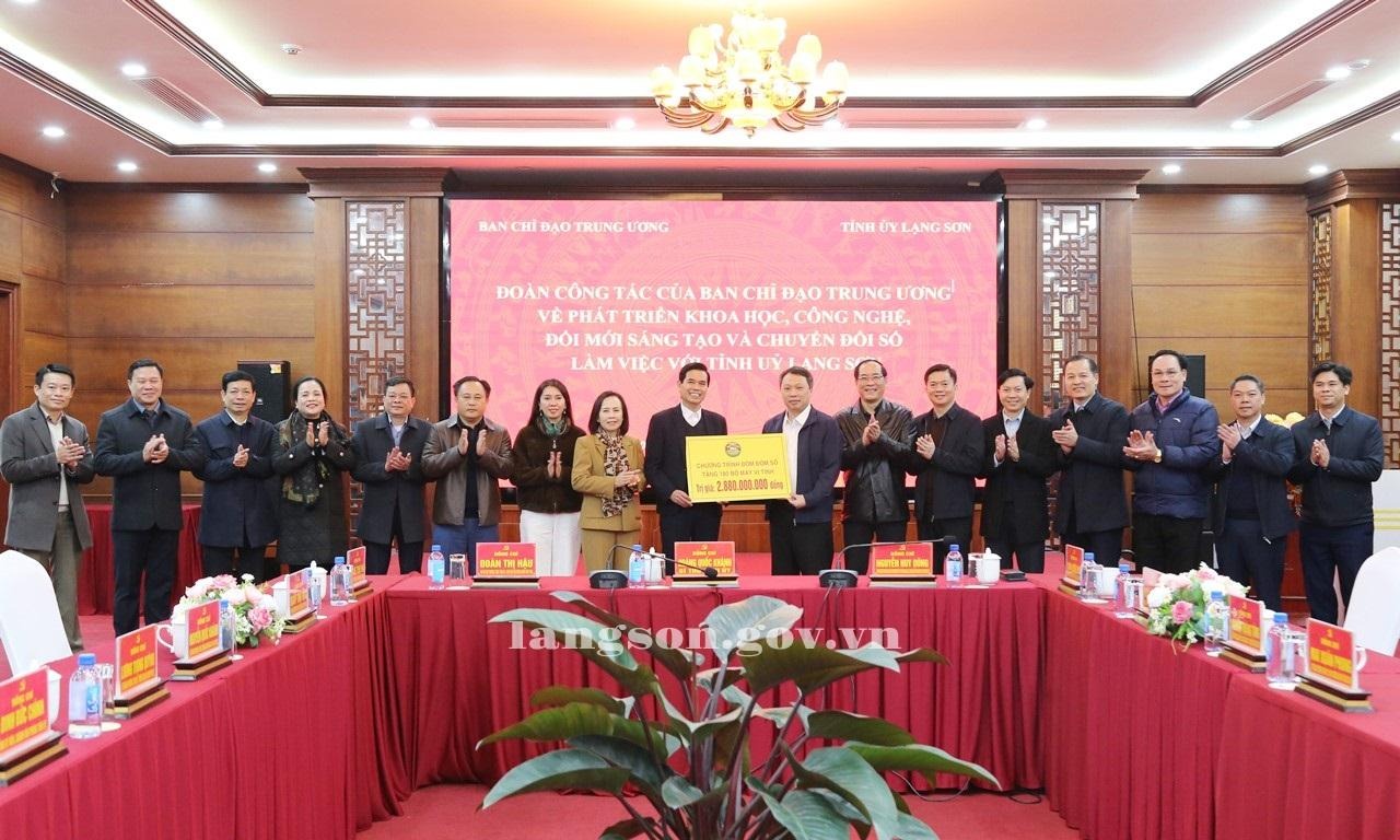 Trong chương trình, đồng chí Nguyễn Huy Dũng, Ủy viên chuyên trách Ban Chỉ đạo Trung ương về phát triển khoa học, công nghệ, đổi mới sáng tạo và chuyển đổi số đã trao tặng 180 bộ máy vi tính với tổng trị giá hơn 2,8 tỷ đồng cho tỉnh Lạng Sơn.