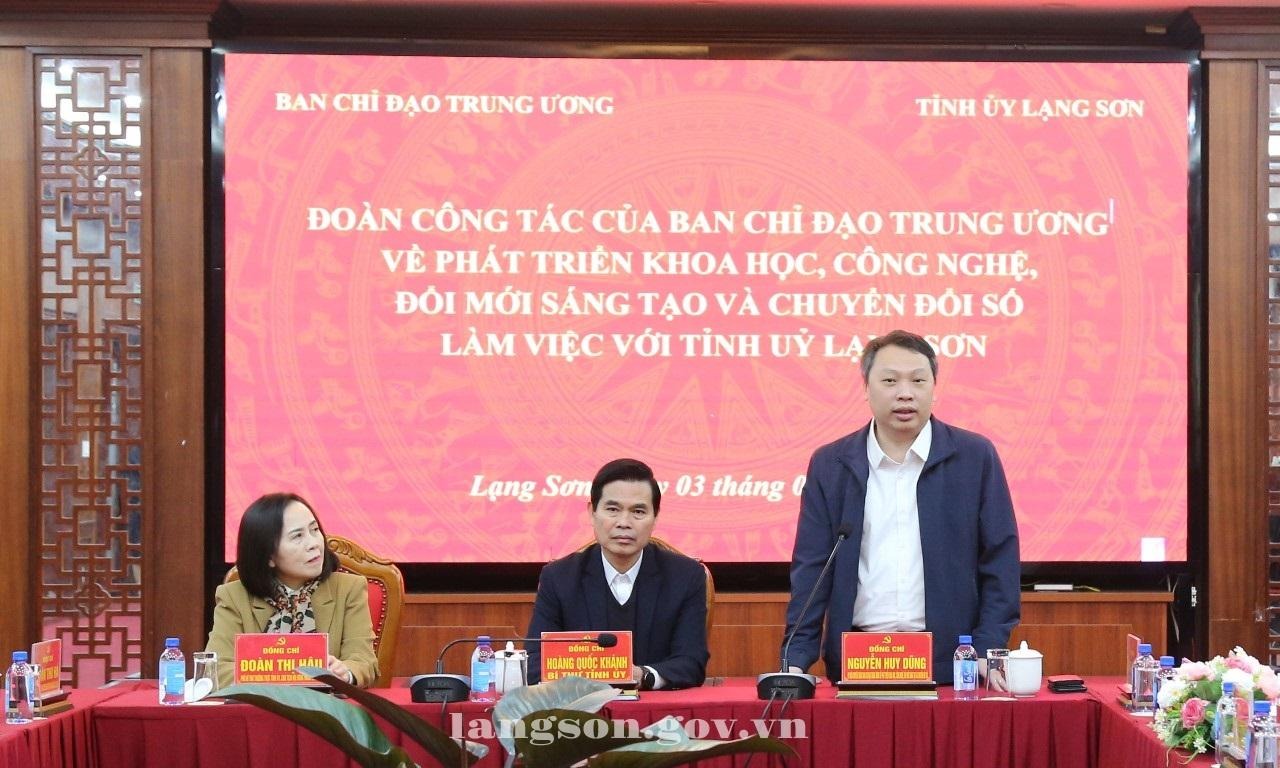 Phát biểu tại buổi làm việc, đồng chí Nguyễn Huy Dũng, Ủy viên chuyên trách Ban Chỉ đạo Trung ương về phát triển khoa học, công nghệ, đổi mới sáng tạo và chuyển đổi số đã chia sẻ sâu sắc trước những khó khăn mà tỉnh Lạng Sơn đã trải qua trong cơn bão số 10 số 11 vừa qua. Đồng chí nhấn mạnh: những bộ máy vi tính được trao tặng cho tỉnh Lạng Sơn không chỉ là thiết bị công nghệ, mà là phương tiện để thu hẹp khoảng cách số, sau những ảnh hưởng nặng nề của thiên tai, việc phục hồi hạ tầng, nhất là hạ tầng số tại các vùng khó khăn, trở thành ưu tiên hàng đầu. Trung ương sẽ luôn sát cánh, dành những nguồn lực thiết thực nhất để Lạng Sơn không chỉ phục hồi sau thiên tai mà còn bứt phá mạnh mẽ trong phát triển khoa học, công nghệ và chuyển đổi số.