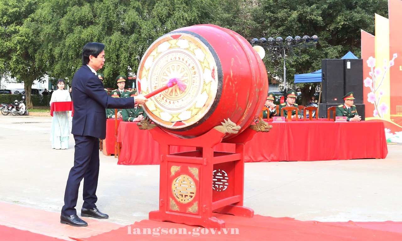Trong chương trình, đồng chí Hoàng Quốc Khánh, Bí thư Tỉnh ủy đã thực hiện nghi thức thắp lửa truyền thống và đánh trống mở hội giao quân năm 2026.