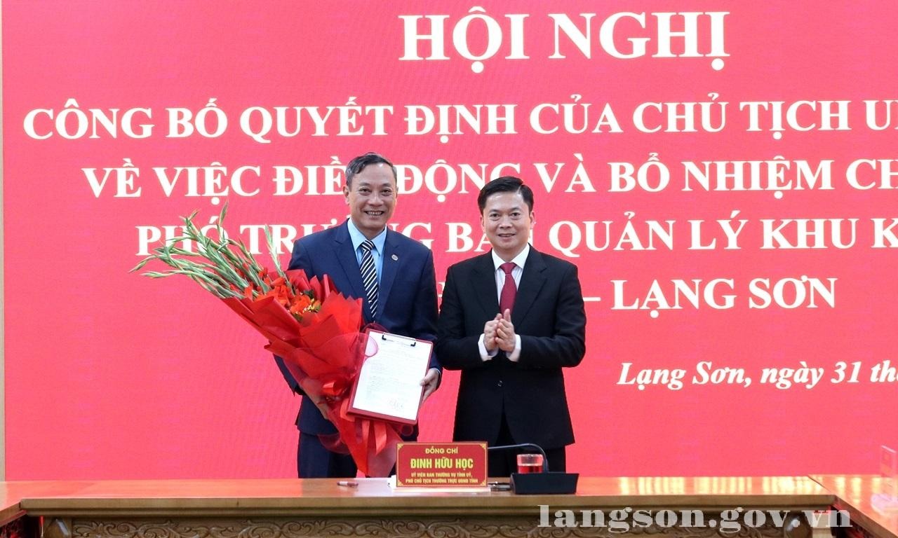 Tại hội nghị, lãnh đạo Sở Nội vụ công bố Quyết định số 2828/QĐ-UBND ngày 30/12/2025 của Chủ tịch UBND tỉnh về việc điều động, bổ nhiệm đồng chí Hoàng Viết Đông, Phó Giám đốc Sở Xây dựng giữ chức vụ Phó Trưởng Ban Quản lý Khu Kinh tế cửa khẩu Đồng Đăng – Lạng Sơn kể từ ngày 01/01/2026. Thời hạn bổ nhiệm 5 năm.