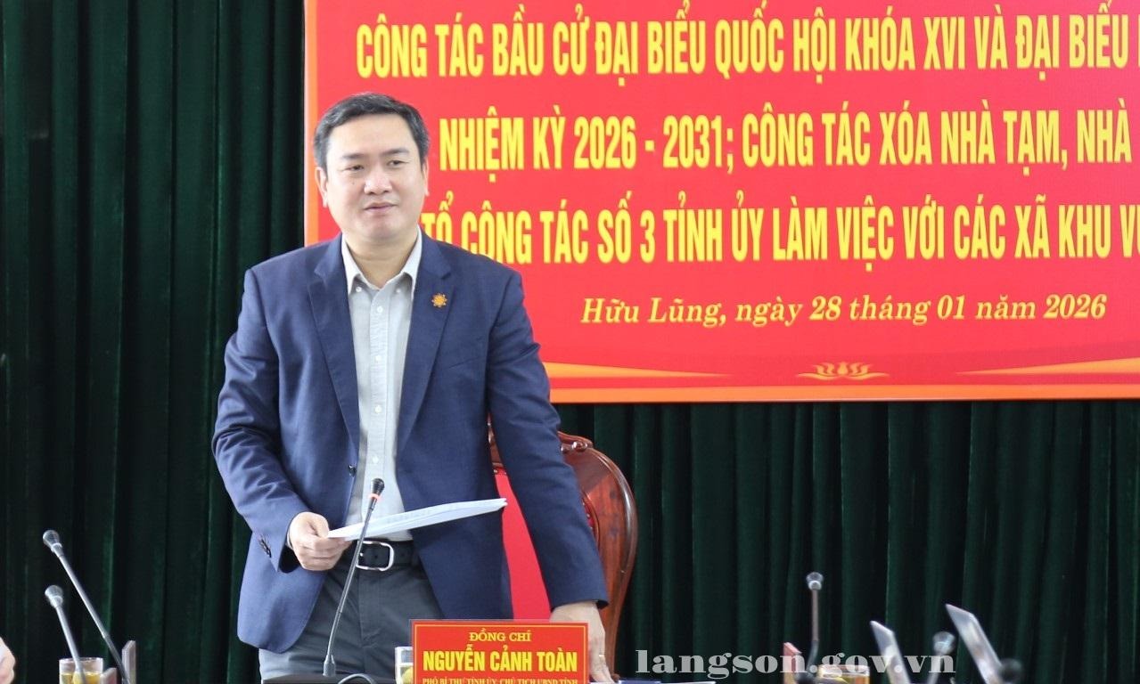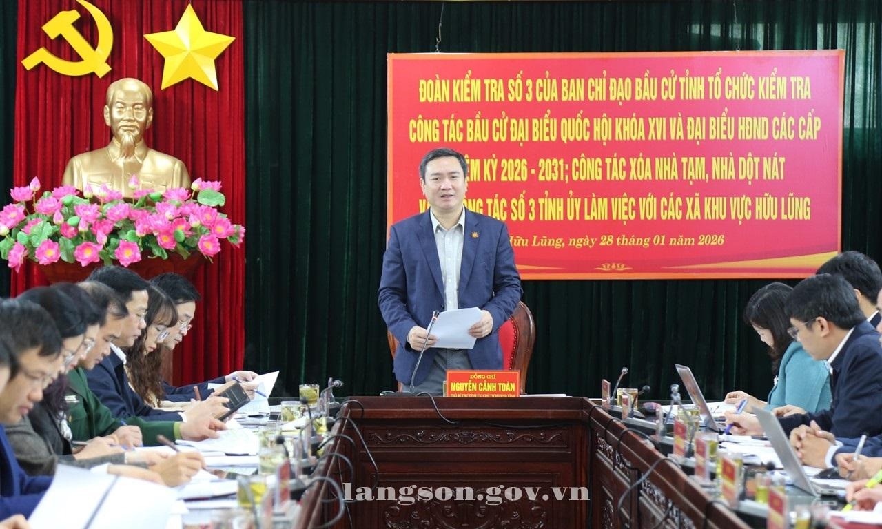 Ngày 28/01/2026, Tổ công tác số 3 của Tỉnh ủy phụ trách Đảng bộ các xã; Đoàn kiểm tra số 3 của Ban Chỉ đạo bầu cử tỉnh do đồng chí Nguyễn Cảnh Toàn, Phó Bí thư Tỉnh ủy, Chủ tịch UBND tỉnh, Phó Trưởng Ban Chỉ đạo, Chủ tịch Ủy ban bầu cử tỉnh làm Trưởng đoàn đã kiểm tra công tác chuẩn bị bầu cử đại biểu Quốc hội khóa XVI và đại biểu HĐND các cấp nhiệm kỳ 2026 - 2031; kiểm tra công tác xóa nhà tạm, nhà dột nát; làm việc với các xã tại khu vực Hữu Lũng.