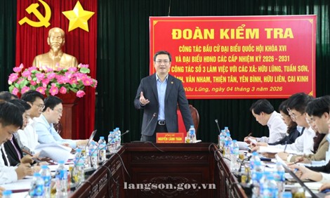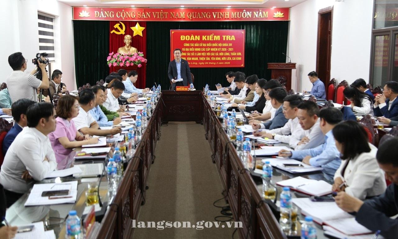 Chiều 04/3/2026, Đoàn kiểm tra số 3 của Ban Chỉ đạo bầu cử tỉnh do đồng chí Nguyễn Cảnh Toàn, Phó Bí thư Tỉnh ủy, Chủ tịch UBND tỉnh làm Trưởng đoàn đã kiểm tra công tác chuẩn bị bầu cử đại biểu Quốc hội khóa XVI và bầu cử đại biểu HĐND các cấp nhiệm kỳ 2026 - 2031 tại các xã: Hữu Lũng, Tuấn Sơn, Tân Thành, Vân Nham, Thiện Tân, Yên Bình, Hữu Liên và Cai Kinh.