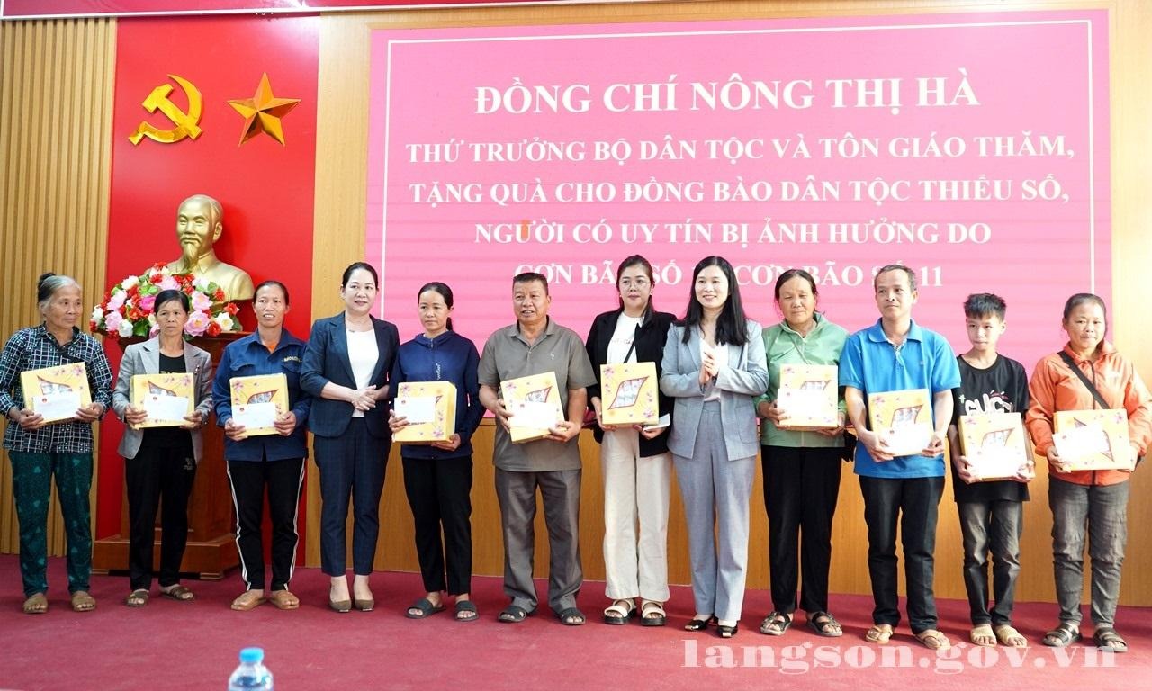 Đồng chí Nông Thị Hà, Thứ trưởng Bộ Dân tộc và Tôn giáo thăm, tặng quà đồng bào dân tộc thiểu số bị thiệt hại do bão tại xã Thất Khê và xã Tràng Định