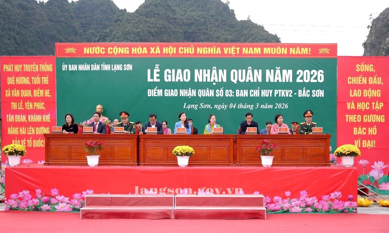 Sáng ngày 04/03/2026, UBND tỉnh tổ chức lễ giao nhận quân năm 2026 tại điểm giao nhận quân số 3: Ban Chỉ huy Phòng thủ khu vực 2 - Bắc Sơn. Dự buổi lễ có đồng chí Trần Thanh Nhàn, Phó Chủ tịch UBND tỉnh; đại diện Bộ Chỉ huy Quân sự tỉnh, Công an tỉnh, một số sở, ban, ngành của tỉnh, các đơn vị nhận quân, cấp uỷ, chính quyền địa phương.
