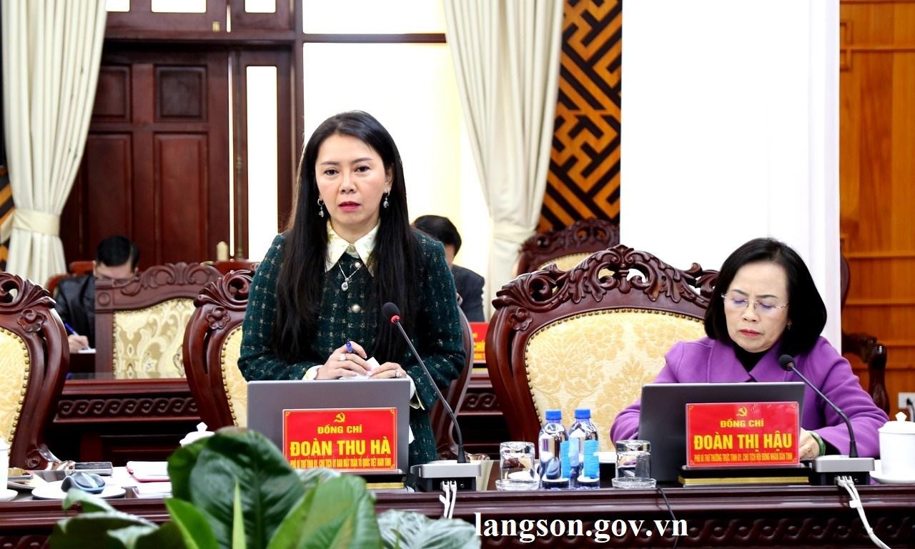 Đồng chí Đoàn Thu Hà, Phó Bí thư Tỉnh ủy, Chủ tịch Ủy ban MTTQ Việt Nam tỉnh phát biểu tại hội nghị