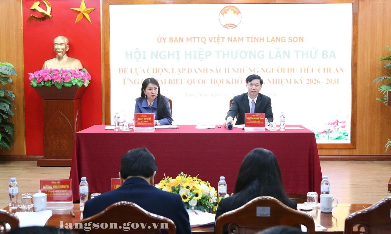 Trên tinh thần dân chủ, khách quan, sau khi thảo luận, 100% đại biểu có mặt đã biểu quyết thống nhất lựa chọn, lập danh sách chính thức 10 người đủ tiêu chuẩn ứng cử đại biểu Quốc hội khóa XVI (giảm 2 ứng cử viên so với hội nghị hiệp thương lần thứ hai, do ứng cử viên làm đơn xin rút) và 85 người đủ tiêu chuẩn ứng cử đại biểu HĐND tỉnh Lạng Sơn khóa XVIII nhiệm kỳ 2026 - 2031 (giảm 10 ứng cử viên so với hội nghị hiệp thương lần thứ hai, do ứng cử viên làm đơn xin rút).