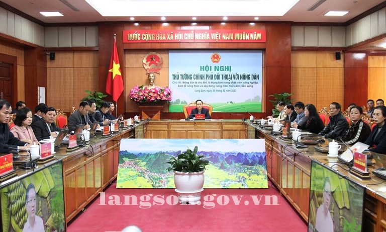 Chiều 30/12/2023, Thủ tướng Chính phủ Phạm Minh Chính chủ trì hội nghị đối thoại với nông dân (ND) Việt Nam năm 2023 với chủ đề: ND là chủ thể, là trung tâm trong phát triển nông nghiệp (NN), kinh tế nông thôn (NT) và xây dựng nông thôn mới (NTM) xanh, bền vững. Hội nghị được kết nối trực tuyến đến điểm cầu tại 63 tỉnh, thành phố. Dự hội nghị tại điểm cầu tỉnh Lạng Sơn có đồng chí Hồ Tiến Thiệu, Phó Bí thư Tỉnh uỷ, Chủ tịch UBND tỉnh, đại diện lãnh đạo một số sở, ban, ngành của tỉnh, lãnh đạo hội ND các huyện, thành phố và đại diện các hộ ND, Hợp tác xã (HTX) tiêu biểu trên địa bàn tỉnh.