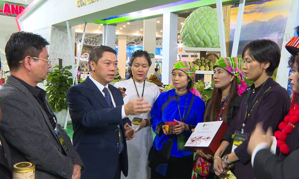 Đồng chí Đoàn Thanh Sơn, Phó Chủ tịch UBND tỉnh thăm gian hàng trưng bày các sản phẩm OCOP của tỉnh Lạng Sơn