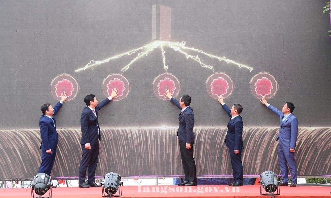 Các đại biểu ấn nút khai trương Đường hoa Xuân Xứ Lạng và khai mạc triển lãm Di sản văn hóa vùng Công viên địa chất toàn cầu UNESCO Lạng Sơn