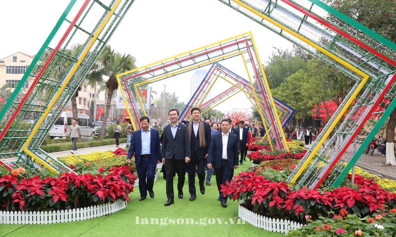 Các đồng chí lãnh đạo tỉnh và các đại biểu tham quan Đường hoa Xuân Xứ Lạng