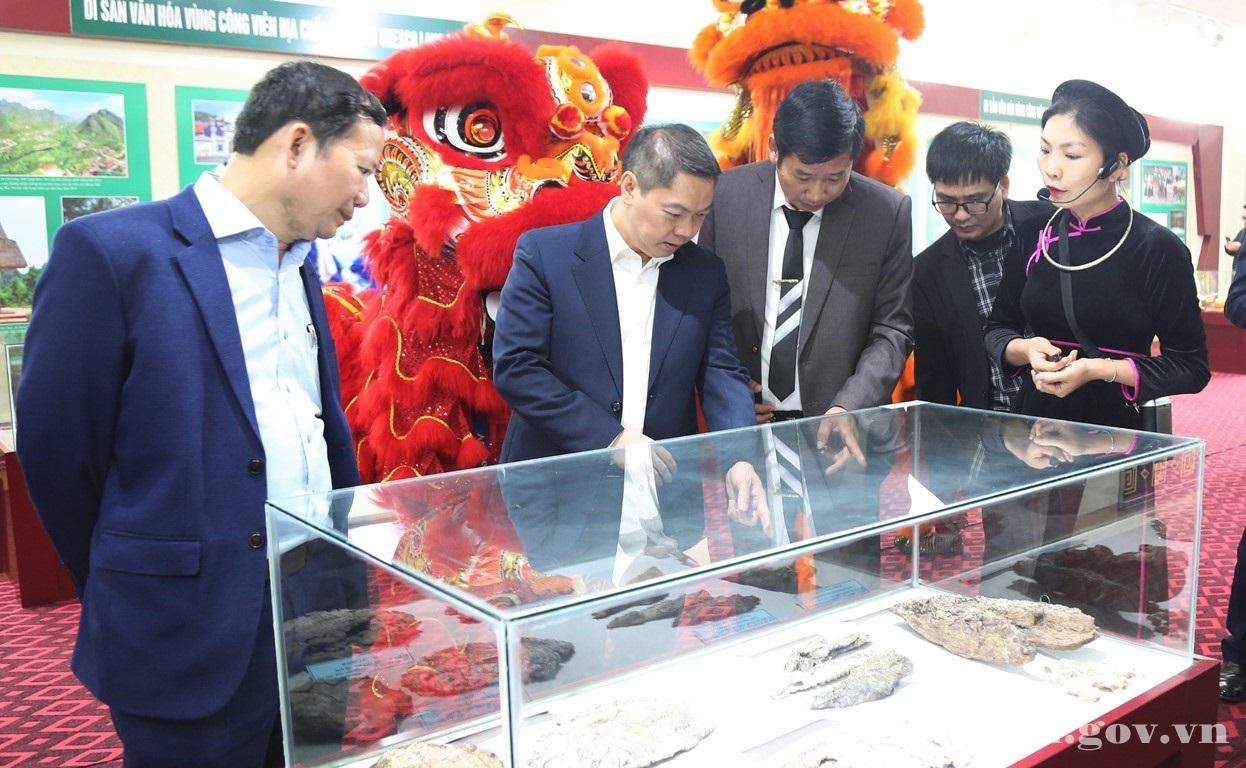 Đồng chí Đoàn Thanh Sơn, Phó Chủ tịch UBND tỉnh và các đại biểu tham quan triển lãm Di sản văn hoá vùng Công viên địa chất toàn cầu UNESCO Lạng Sơn